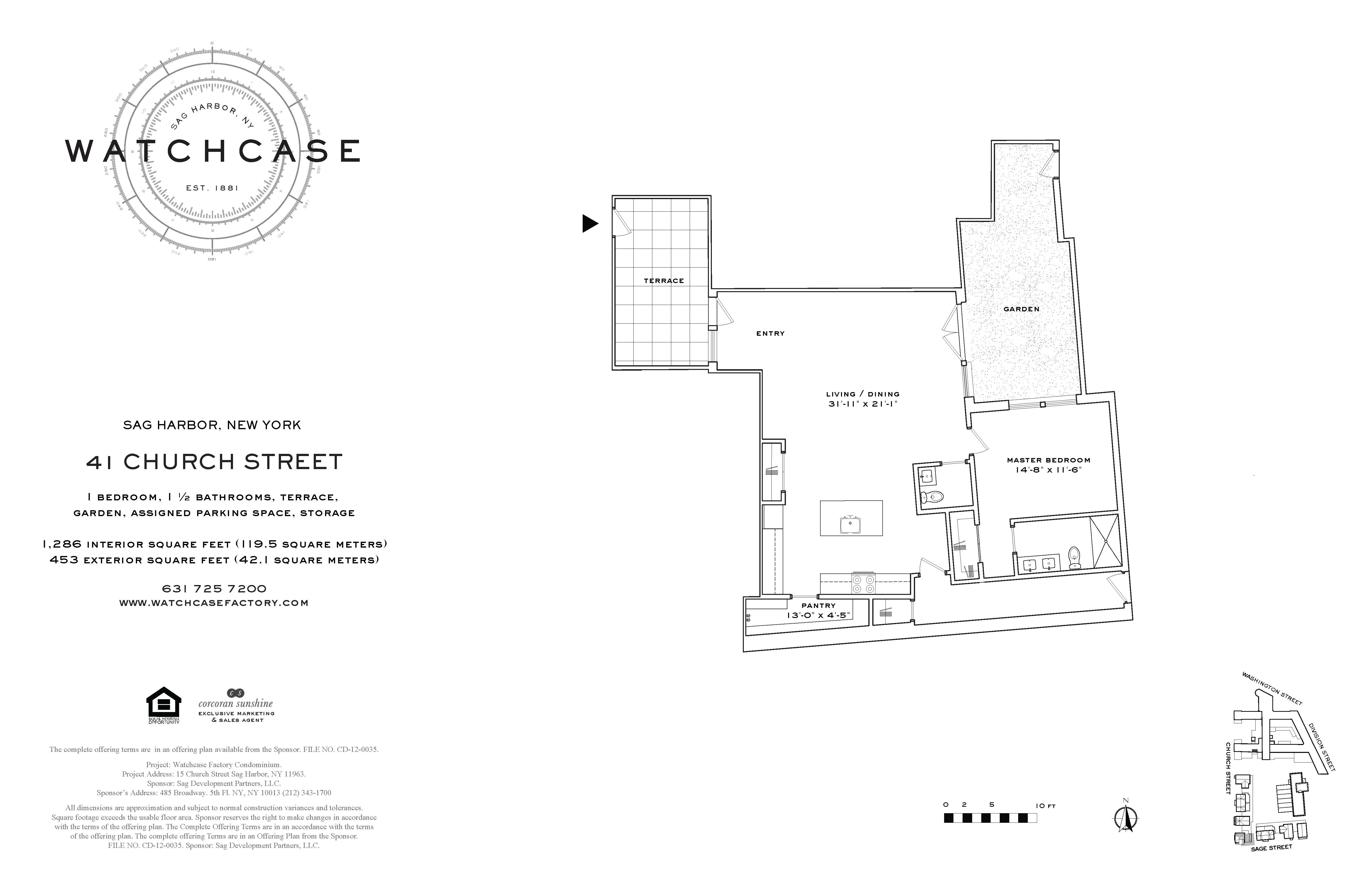 Located on the corner of Church and Sage Streets in the heart of Sag Harbor Village Main, this one bedroom Flagship Bungalow has 1,286 sf. of interior space, 13 ft. ceilings with a private garden, mud room, laundry closet, powder room, ensuite master bedroom, Murphy bed flex space and much more. There is a luxurious 4-fixture master bathroom with Waterworks fixtures. The open kitchen and living area create an ideal layout for entertaining guests. There is direct access from the garden to the pool and Watchcase Pavilion, completing the resort-style feel. Designated underground parking space. Robust rental potential. Watchcase Amenities include: Live-in resident manager, building superintendent, concierge, heated saltwater pool, fitness center, yoga studio, locker rooms with sauna, treatment room, and events lounge with fireplace and catering kitchen. The Grand Lobby Living Room hosts the Vault Bar and a massive two-sided fireplace. Don't miss this opportunity to live in some of the most coveted residences anywhere in the Hamptons.