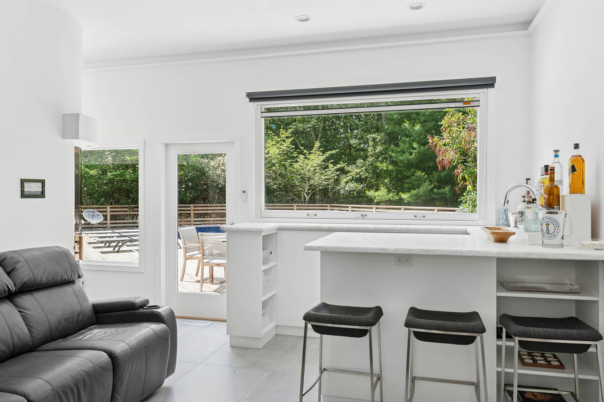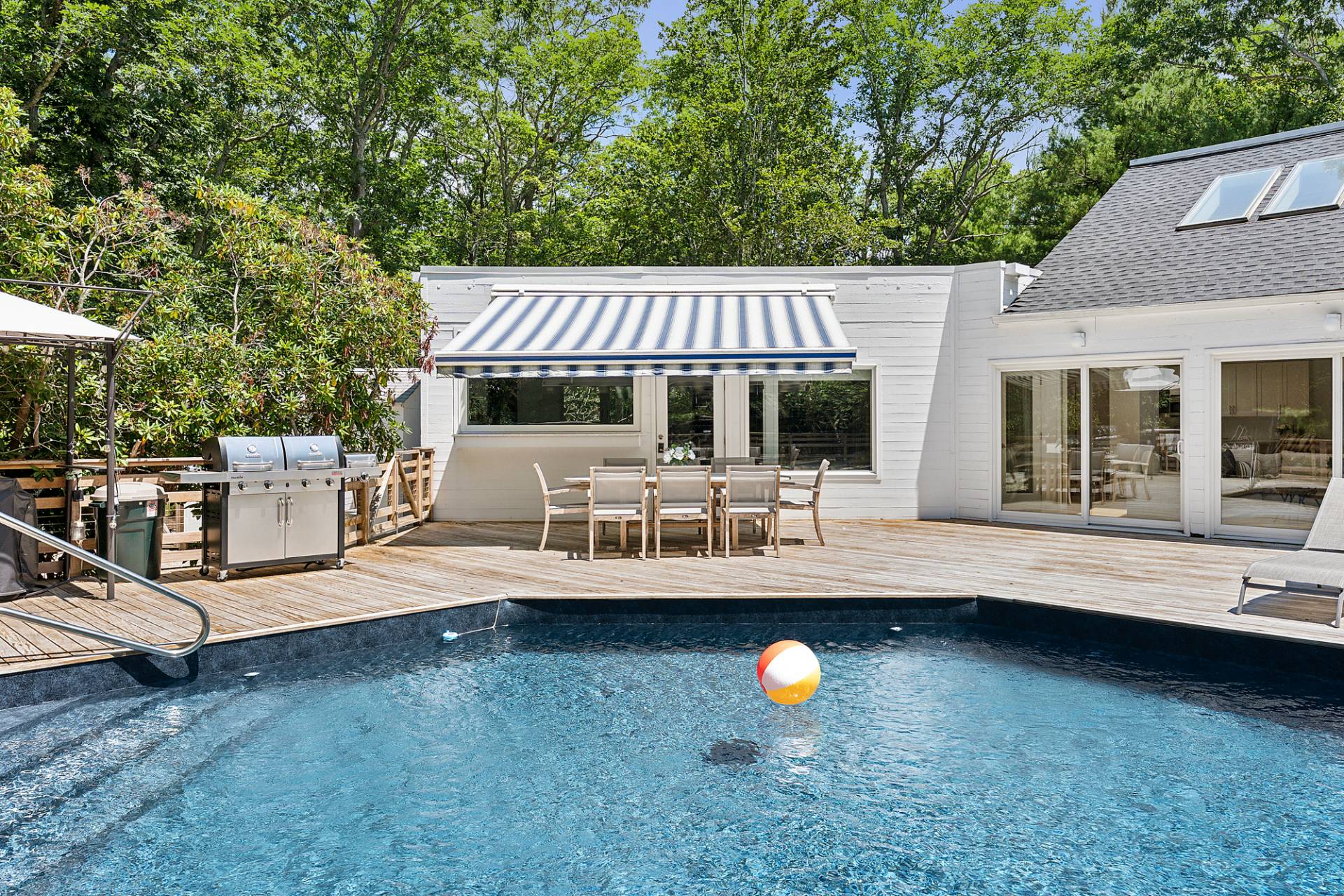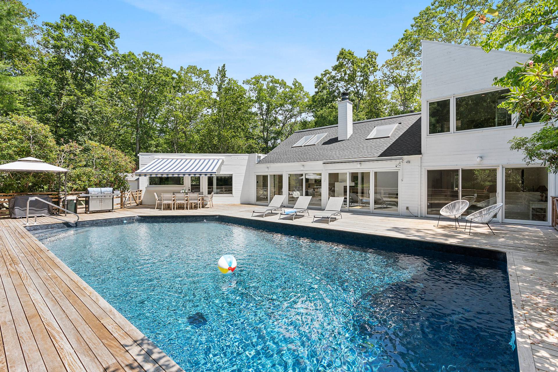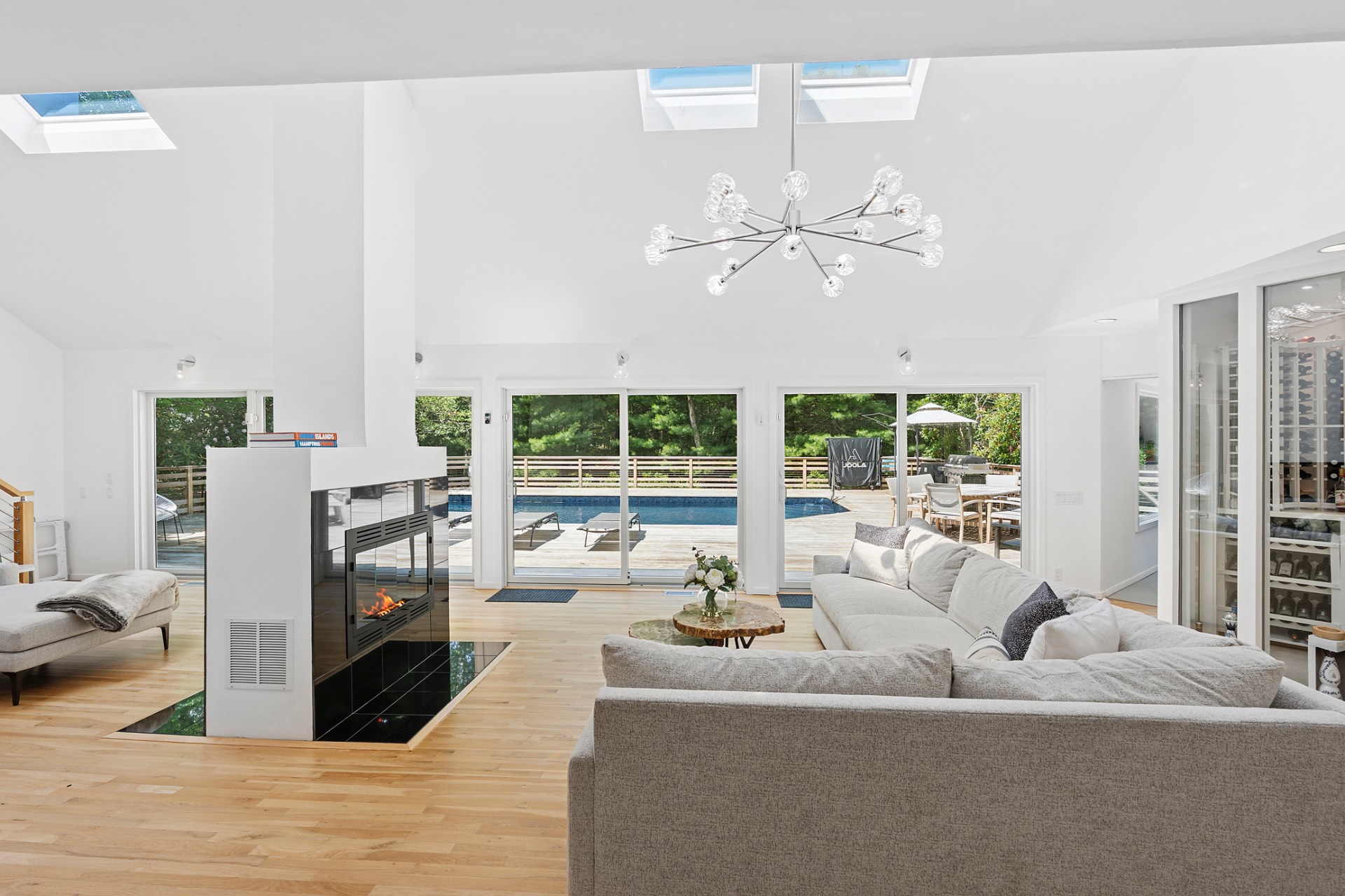 You have just found perfection in this newly renovated contemporary coastal escape, ready for immediate luxury living close to everything you love about the Hamptons. Privately located on 1.41+/- acres, this chic 2,900 +/- sq. ft. turnkey home with a new roof and all new windows & doors offers five bedrooms and four full and one half sleek, modern, newly renovated baths. Interiors are immediately impressive with beautifully refinished hardwood floors and abundant natural light. On the main level is the great room featuring a central dual-sided gas fireplace, arched ceilings with skylights, and 3 large sliding glass doors leading to the sunny heated saltwater pool, complete with new liner, new heater & impressively surrounded by Brazilian hardwood decking with under rail lighting-making this the home's centerpiece. Natural light from the central skylight beams through the kitchen, which has extended eat-in countertops and stainless-steel appliances. Adjacent, there is a dedicated, comfortable, and spacious dining area. Perfect for entertainers and wine enthusiasts, is a glass-enclosed, temperature-regulated walk-in wine room. Tucked away, you'll find the recreation room/den featuring a built-in wet bar with seating, a beverage refrigerator, and a large pass-through window that connects the indoor bar with the pool area. Completing the vision of resort living is a newly installed and well-sized cedar sauna and a full bath. Also on the first floor are two bright, sun-filled bedrooms-one overlooking the pool, along with another full bath and a half bath. For your convenience, the laundry is also on this main level. The second level of this fresh modern home features a spacious ensuite primary bedroom with a custom-built walk-in closet, along with two more bedrooms that share a full bath. Other upgrades to this one-of-a-kind Hamptons home include new mechanicals, new ductless AC units in the three upstairs bedrooms, a new indoor staircase, and railings. Privately sited and surrounded by natural landscaping, the home is located within minutes to multiple water access, bay beaches, waterfront restaurants, and all that East Hampton Village has to offer.