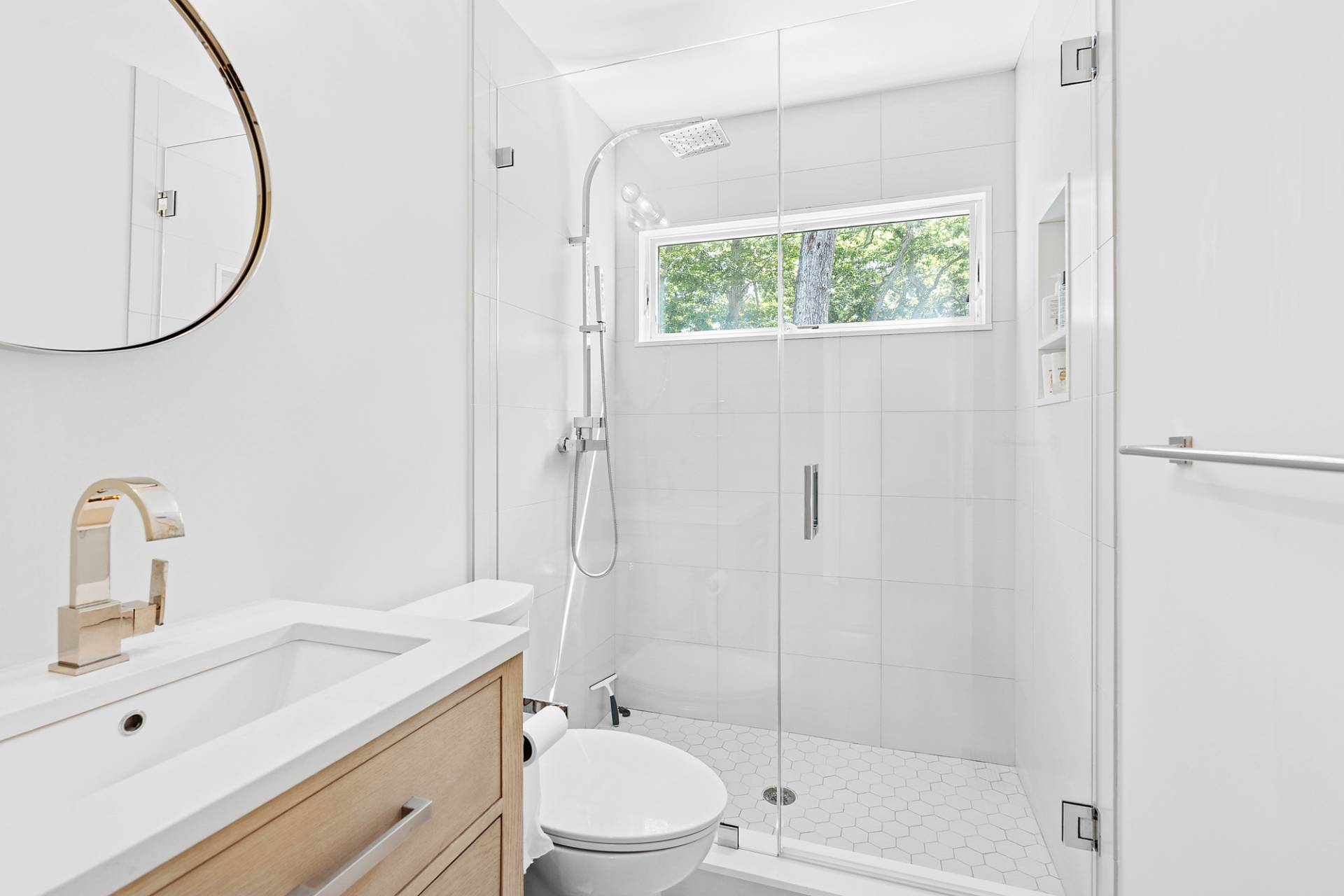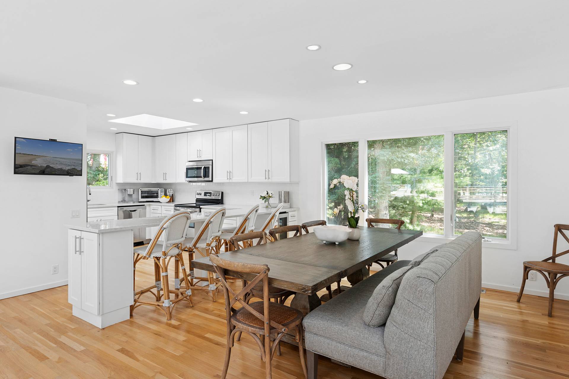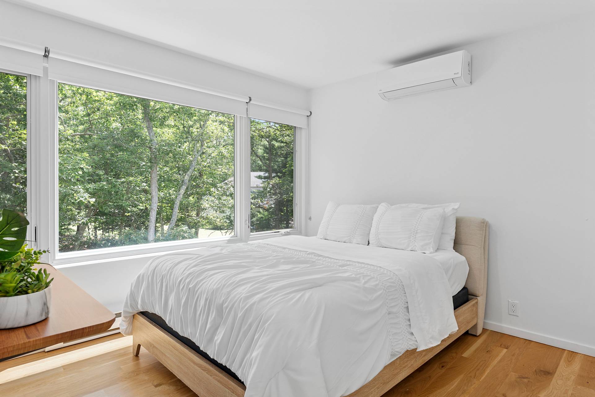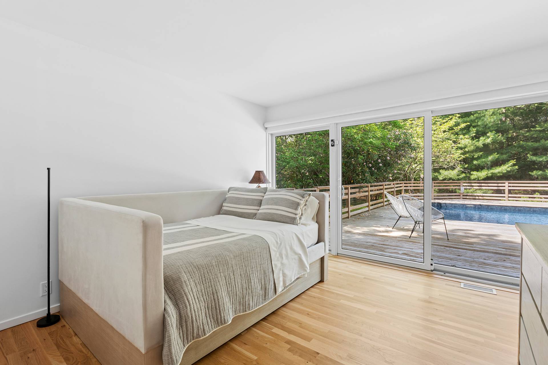 You have just found perfection in this newly renovated contemporary coastal escape, ready for immediate luxury living close to everything you love about the Hamptons. Privately located on 1.41+/- acres, this chic 2,900 +/- sq. ft. turnkey home with a new roof and all new windows & doors offers five bedrooms and four full and one half sleek, modern, newly renovated baths. Interiors are immediately impressive with beautifully refinished hardwood floors and abundant natural light. On the main level is the great room featuring a central dual-sided gas fireplace, arched ceilings with skylights, and 3 large sliding glass doors leading to the sunny heated saltwater pool, complete with new liner, new heater & impressively surrounded by Brazilian hardwood decking with under rail lighting-making this the home's centerpiece. Natural light from the central skylight beams through the kitchen, which has extended eat-in countertops and stainless-steel appliances. Adjacent, there is a dedicated, comfortable, and spacious dining area. Perfect for entertainers and wine enthusiasts, is a glass-enclosed, temperature-regulated walk-in wine room. Tucked away, you'll find the recreation room/den featuring a built-in wet bar with seating, a beverage refrigerator, and a large pass-through window that connects the indoor bar with the pool area. Completing the vision of resort living is a newly installed and well-sized cedar sauna and a full bath. Also on the first floor are two bright, sun-filled bedrooms-one overlooking the pool, along with another full bath and a half bath. For your convenience, the laundry is also on this main level. The second level of this fresh modern home features a spacious ensuite primary bedroom with a custom-built walk-in closet, along with two more bedrooms that share a full bath. Other upgrades to this one-of-a-kind Hamptons home include new mechanicals, new ductless AC units in the three upstairs bedrooms, a new indoor staircase, and railings. Privately sited and surrounded by natural landscaping, the home is located within minutes to multiple water access, bay beaches, waterfront restaurants, and all that East Hampton Village has to offer.
