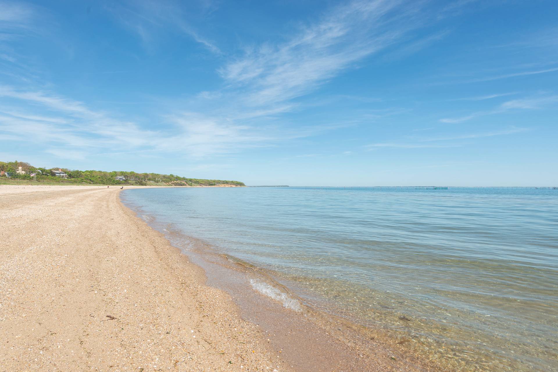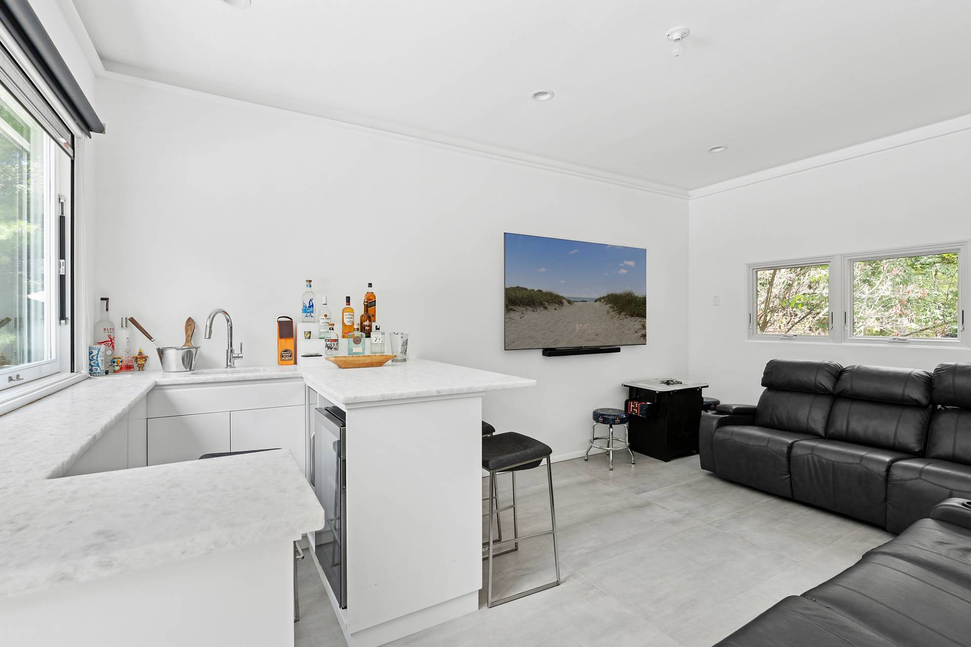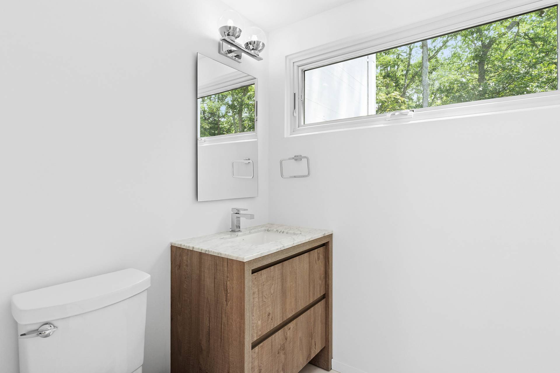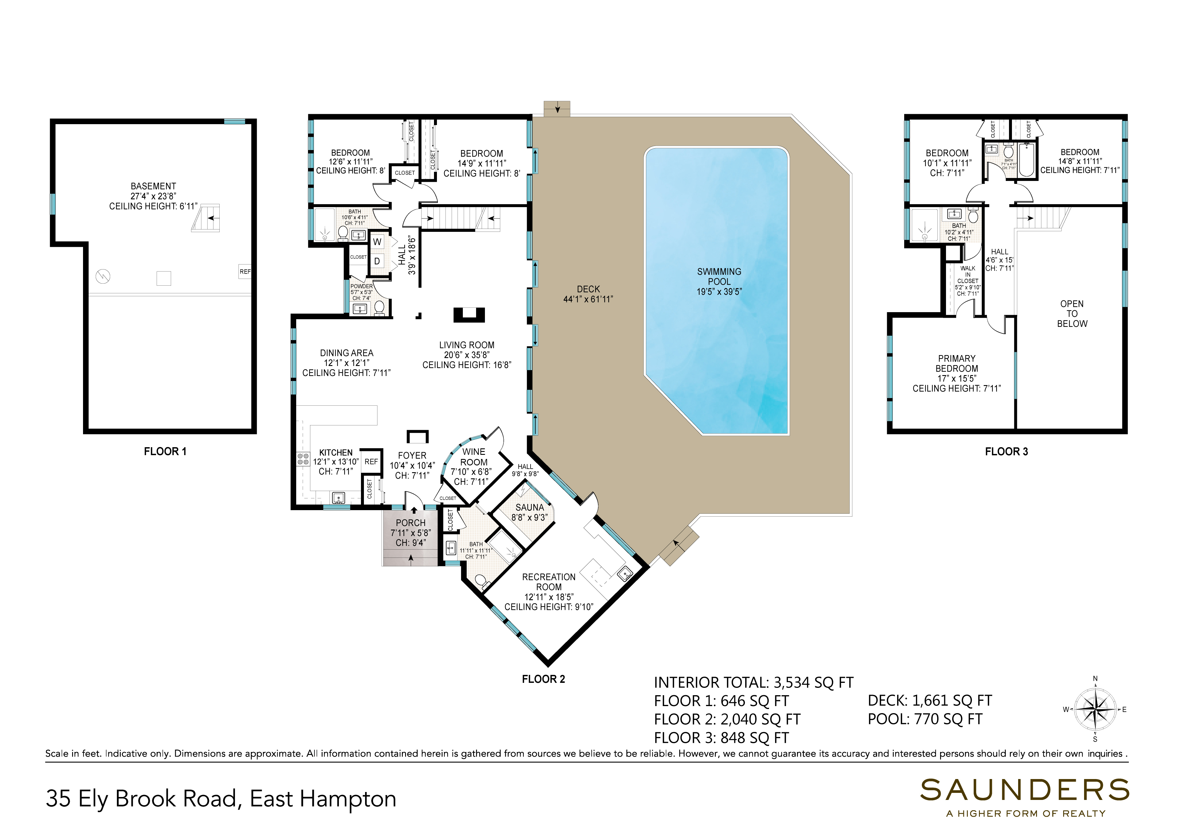 You have just found perfection in this newly renovated contemporary coastal escape, ready for immediate luxury living close to everything you love about the Hamptons. Privately located on 1.41+/- acres, this chic 2,900 +/- sq. ft. turnkey home with a new roof and all new windows & doors offers five bedrooms and four full and one half sleek, modern, newly renovated baths. Interiors are immediately impressive with beautifully refinished hardwood floors and abundant natural light. On the main level is the great room featuring a central dual-sided gas fireplace, arched ceilings with skylights, and 3 large sliding glass doors leading to the sunny heated saltwater pool, complete with new liner, new heater & impressively surrounded by Brazilian hardwood decking with under rail lighting-making this the home's centerpiece. Natural light from the central skylight beams through the kitchen, which has extended eat-in countertops and stainless-steel appliances. Adjacent, there is a dedicated, comfortable, and spacious dining area. Perfect for entertainers and wine enthusiasts, is a glass-enclosed, temperature-regulated walk-in wine room. Tucked away, you'll find the recreation room/den featuring a built-in wet bar with seating, a beverage refrigerator, and a large pass-through window that connects the indoor bar with the pool area. Completing the vision of resort living is a newly installed and well-sized cedar sauna and a full bath. Also on the first floor are two bright, sun-filled bedrooms-one overlooking the pool, along with another full bath and a half bath. For your convenience, the laundry is also on this main level. The second level of this fresh modern home features a spacious ensuite primary bedroom with a custom-built walk-in closet, along with two more bedrooms that share a full bath. Other upgrades to this one-of-a-kind Hamptons home include new mechanicals, new ductless AC units in the three upstairs bedrooms, a new indoor staircase, and railings. Privately sited and surrounded by natural landscaping, the home is located within minutes to multiple water access, bay beaches, waterfront restaurants, and all that East Hampton Village has to offer.