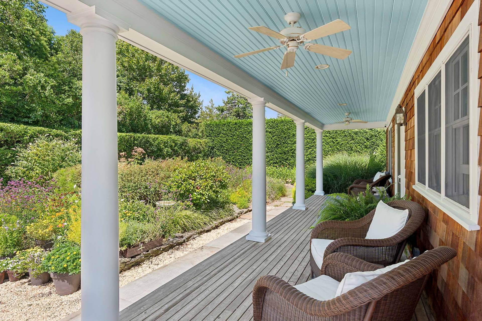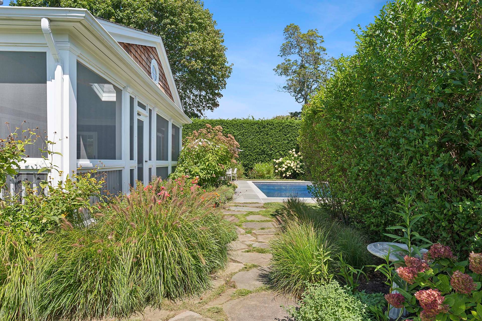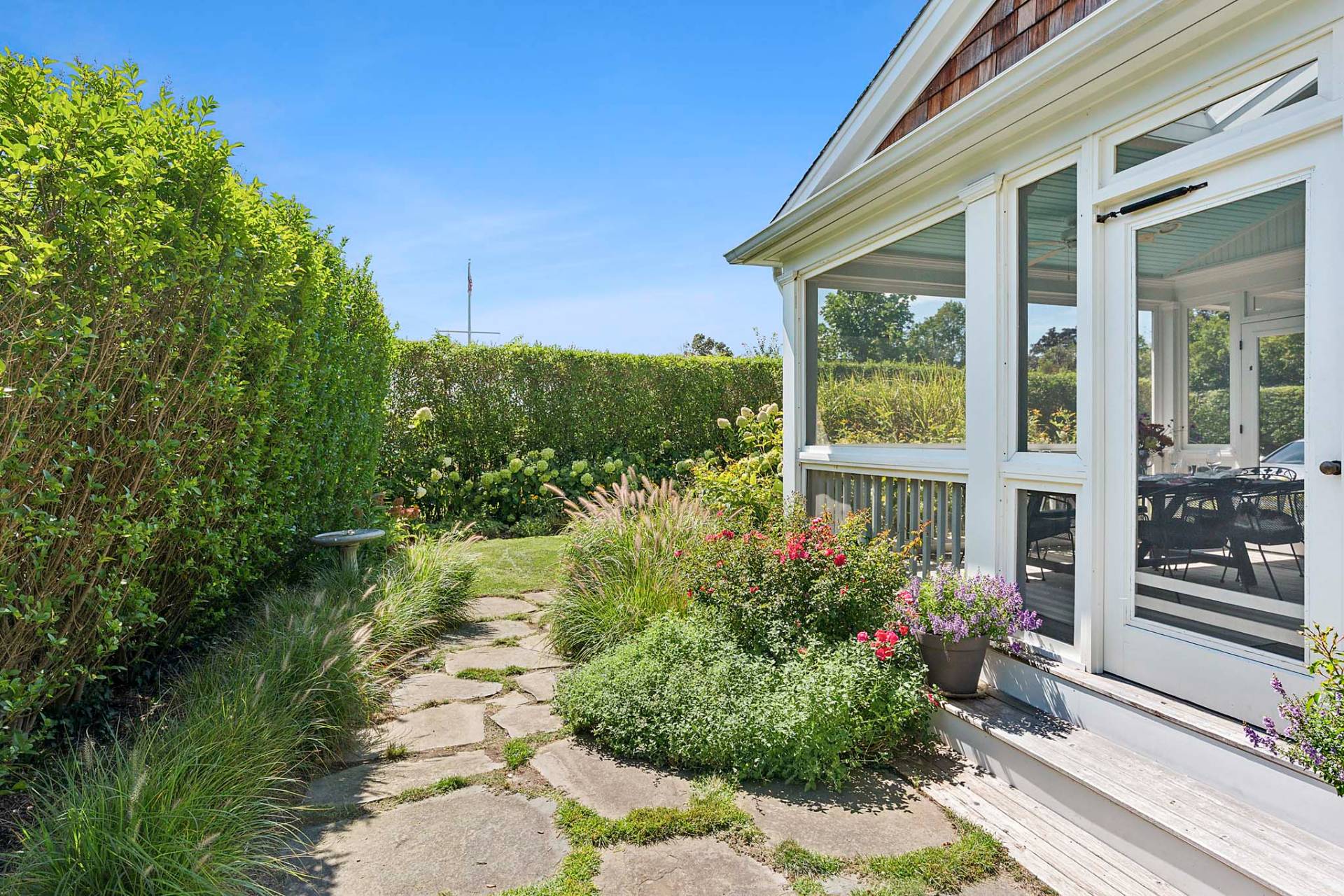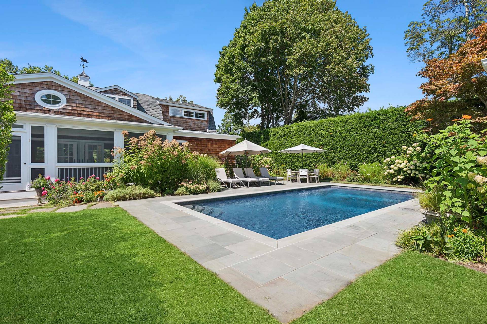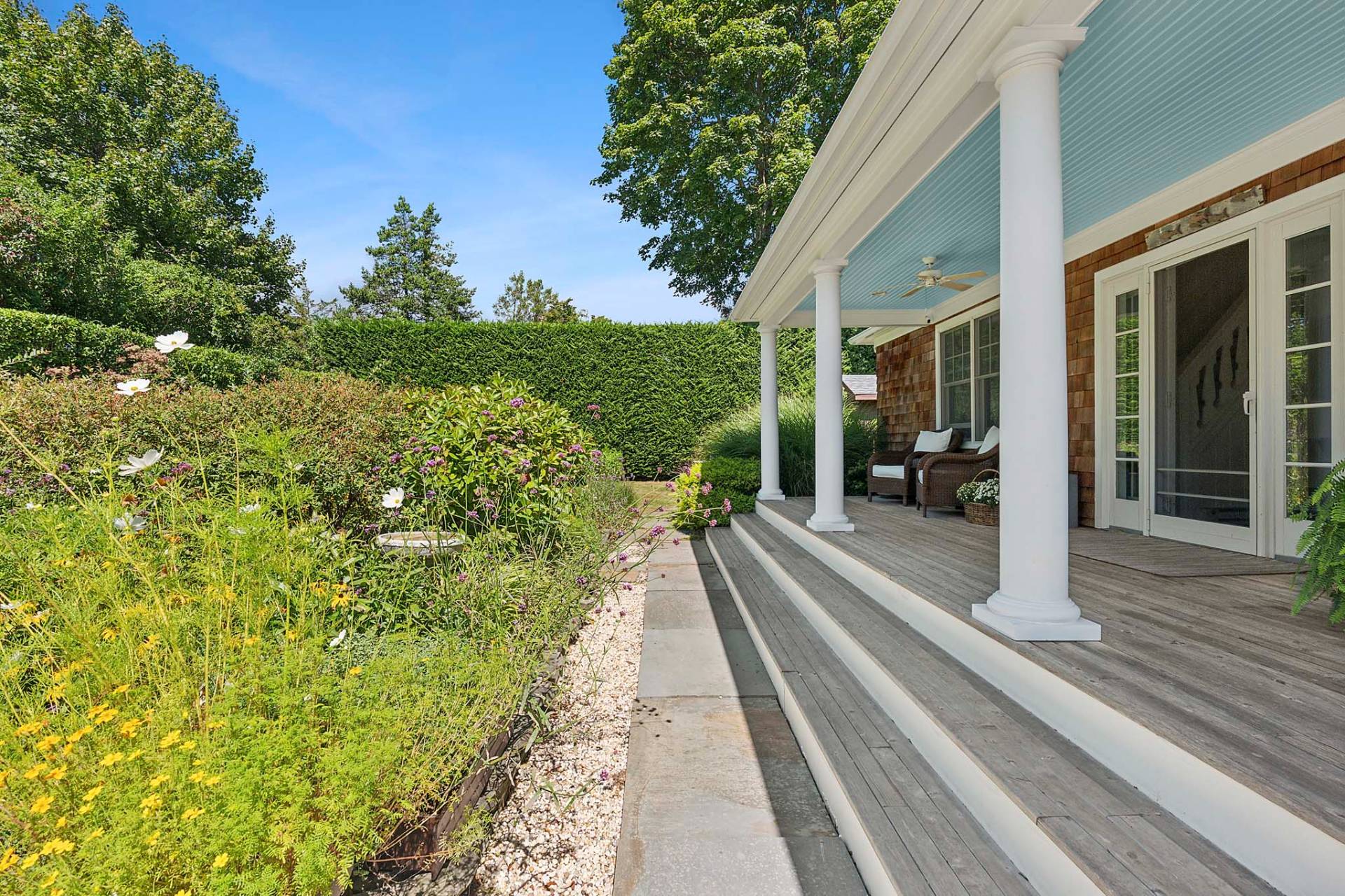 The ultimate Hamptons escape - a thoughtfully converted carriage house designed as a four-bedroom, three-bath residence offering 1,900 +/- square feet of refined living space with a sweeping screened in porch and surrounded by covered porches. Perfectly positioned on a peaceful road with the open bay just at the end, this property captures the essence of coastal luxury while maintaining a warm and welcoming character. From the moment you arrive through the private, gated driveway, you are embraced by elegant gardens with mature plantings, flowering shrubs, and walkways. Inside, the home is filled with natural light from large windows, with an open layout that flows easily between living, dining, and entertaining areas. Multiple gathering spaces provide flexibility, whether you are hosting a summer dinner party or enjoying a quiet evening at home. Each bedroom is designed for comfort and privacy, while the baths feature updated, timeless finishes. The property and home have been meticulously maintained and ready for instant pleasure. The heart of the outdoor living experience is the Gunite saltwater pool, a true centerpiece for seasonal enjoyment with a spacious patio for lounging and dining. A detached studio overlooking the lush grounds adds versatility and can serve as a pool cabana, home office, or creative space. With the open bay at the end of the road and some of the Hamptons best beaches, shops, and dining just minutes away, this property delivers the quintessential Hampton experience.