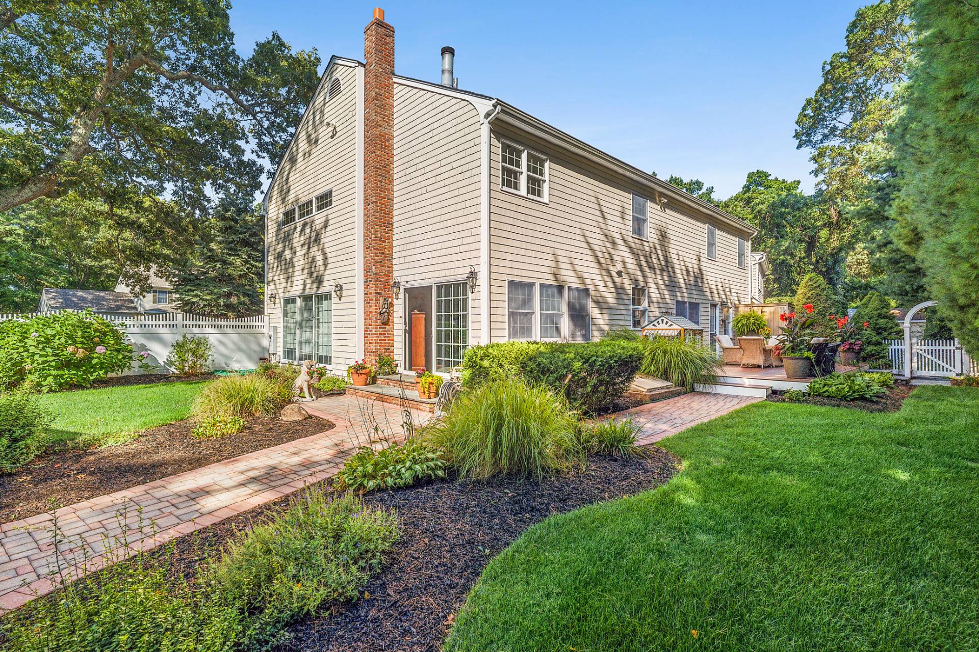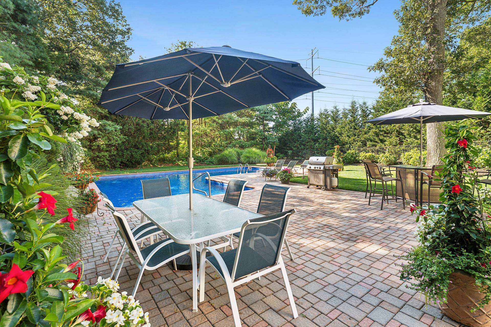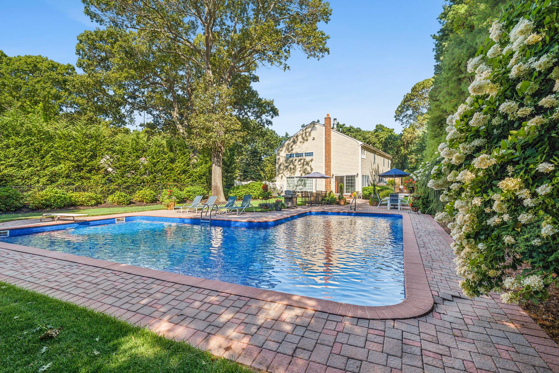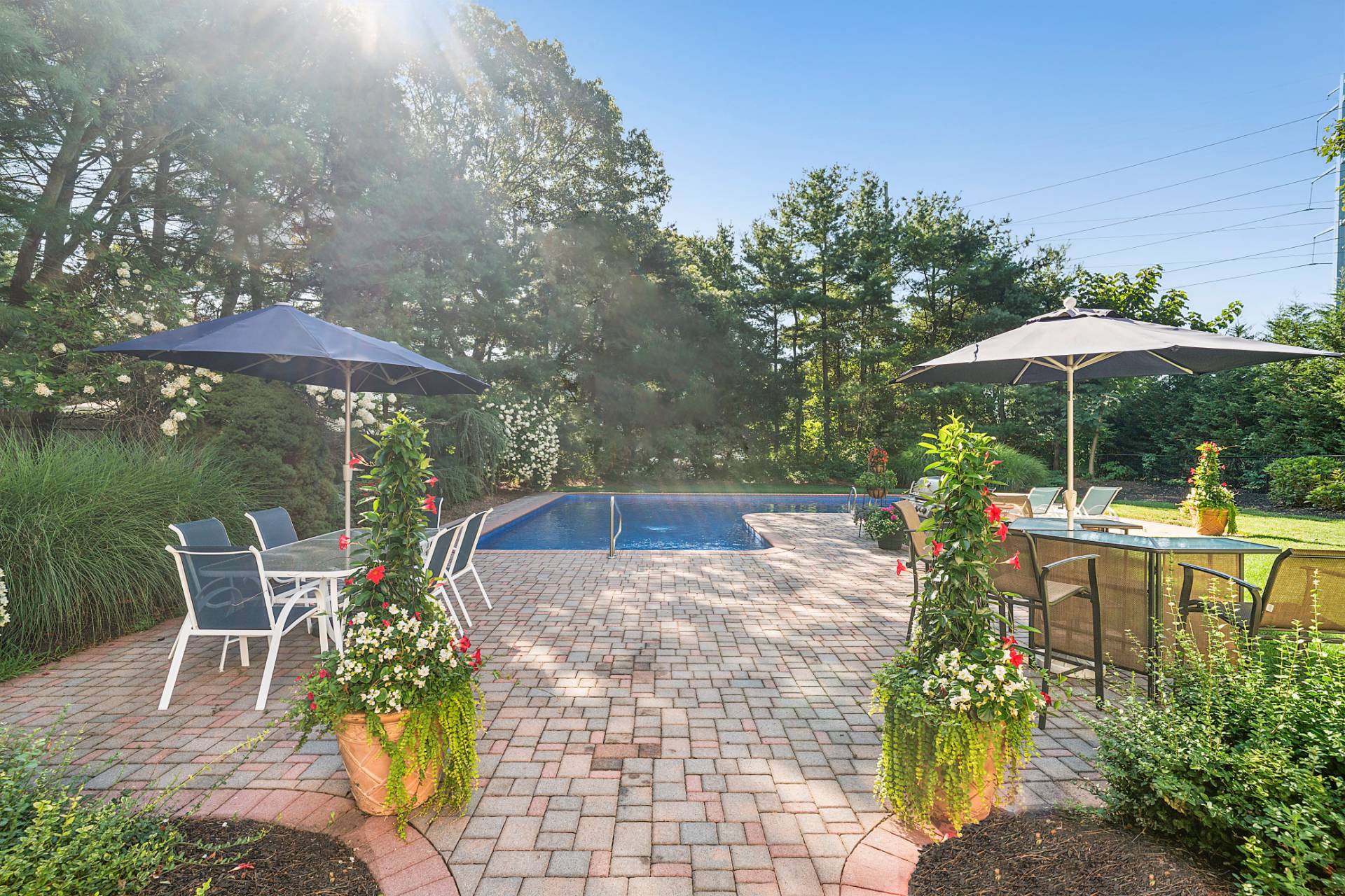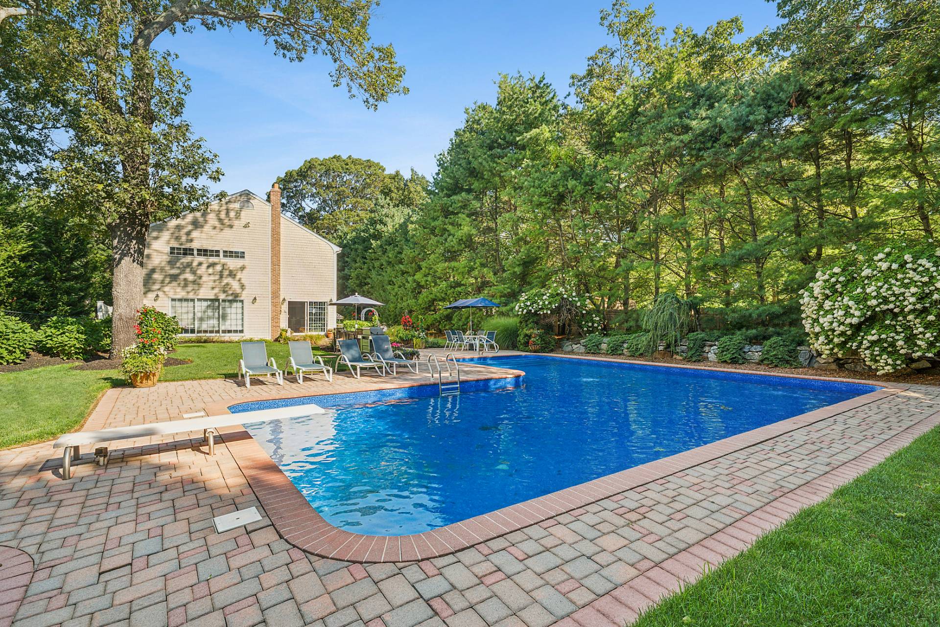 Set on nearly three-quarters of an acre, this elegant Colonial blends timeless design with modern updates. Offering 3,765 +/- sq. ft. of living space, the home features a welcoming foyer, sunlit living and dining rooms, a versatile den/office, and an eat-in kitchen at the heart of the home. The second floor includes a primary bedroom suite with a walk-in closet and spacious bath & office, along with 2 more guest bedrooms and full bath. An expansive addition over the garage creates even more flexibility, with a private bedroom, living room, dining area, and 1.5 baths - ideal for loved ones, guests, or a separate retreat. Outdoors, a 20'x40' saltwater pool is the centerpiece, surrounded by a spacious patio, outdoor shower, and lush landscaping. Additional highlights include a 2-car garage, cedar shake siding, hardwood floors, and 2-zone heating and central air. Private and thoughtfully maintained, this residence is designed for both comfortable living and effortless entertaining.