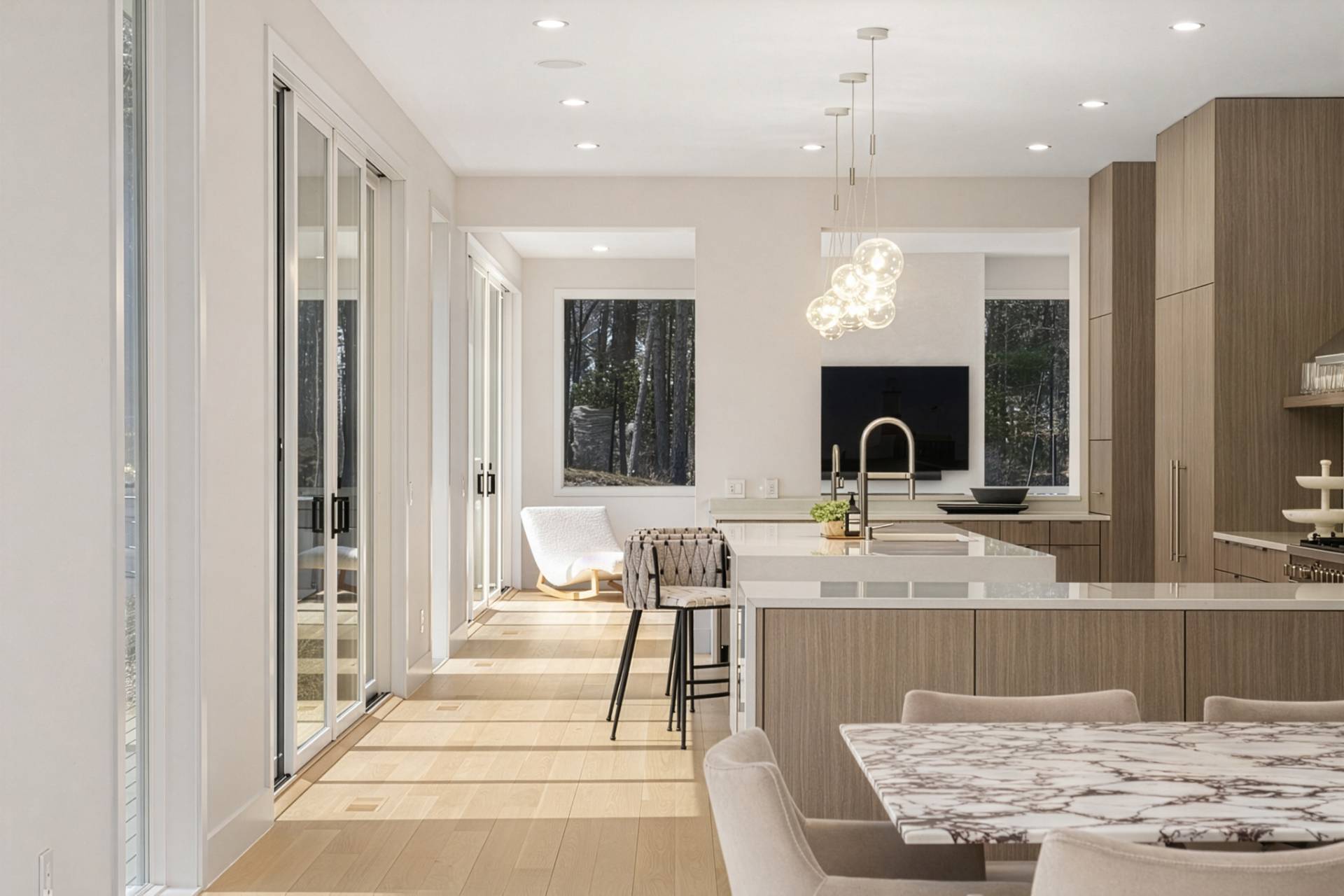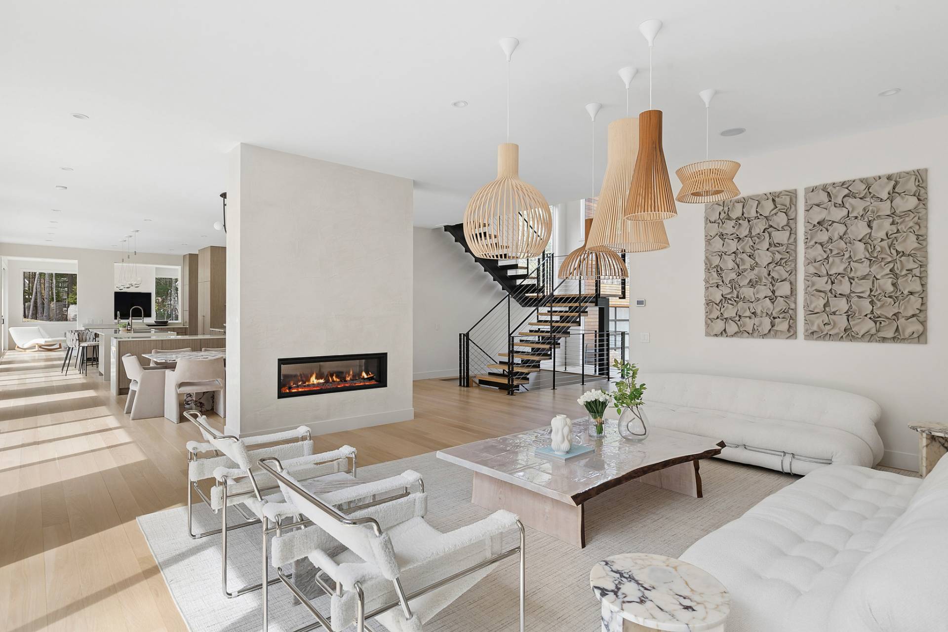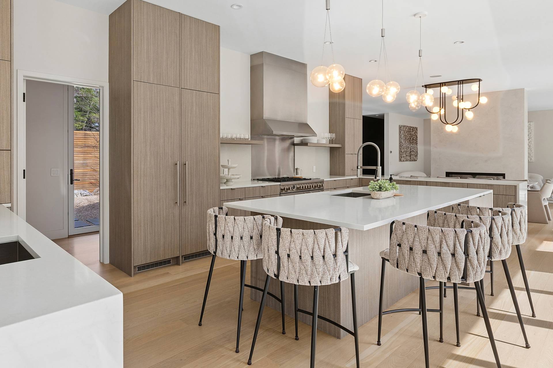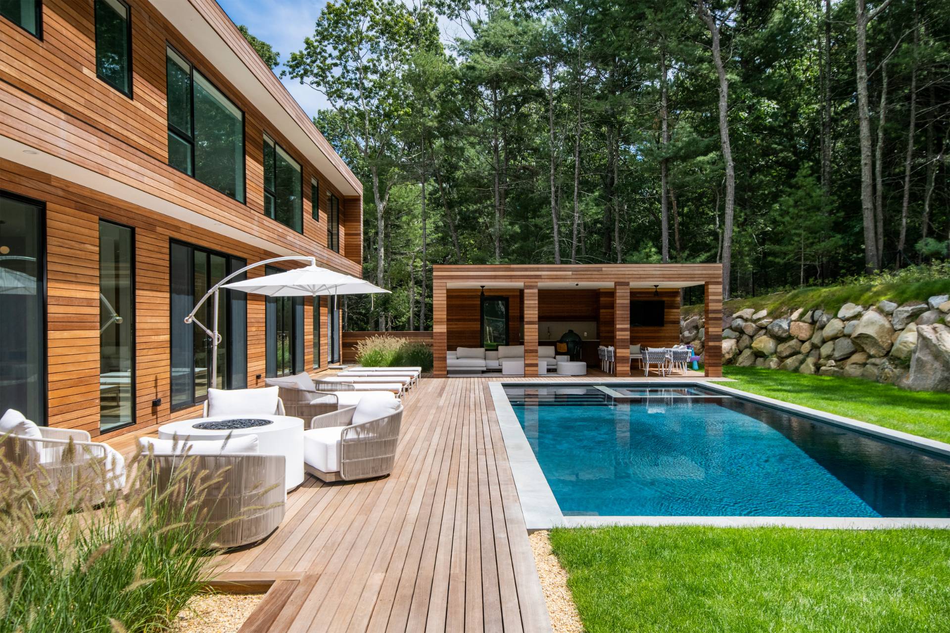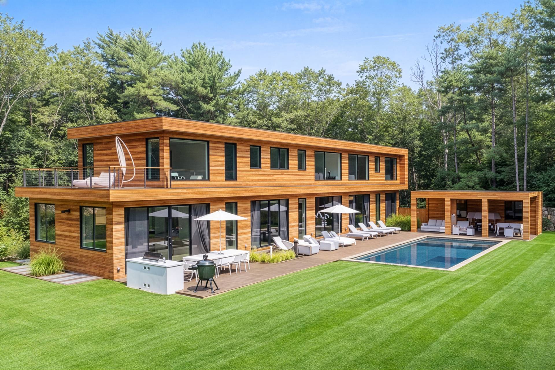 Luxury, sustainability, and elegance are yours in this 7400 +/- SF modern residence tucked away on nearly 3 acres of serenity. Cutting-edge design by Modern NetZero capitalizes on the cascading natural light, expanding the connection between the open floor plan and the outdoors. A dramatic entry with custom, floating steel staircase welcomes you to the chic living area accented with a double-sided fireplace adjoining the dining room. The streamlined kitchen with walk-in pantry leads to a sunroom with a gas fireplace. The main level features a junior primary suite and a second en suite bedroom. Slide open the southern wall of glass doors to an entertaining and lounging oasis with saltwater pool, spa, and a pool house that encompasses an outdoor shower, half bath, and covered dining. There is room for a tennis court oriented toward North/South. The second floor showcases the primary suite with its mahogany terrace and spa-like bathroom. The lower level offers a large media room, full gym, and three additional bedroom suites. Form, function, and fun follow the sun right here, just a quick beat away from both East Hampton and Sag Harbor Villages. A long list of amenities elevates this home above the rest.