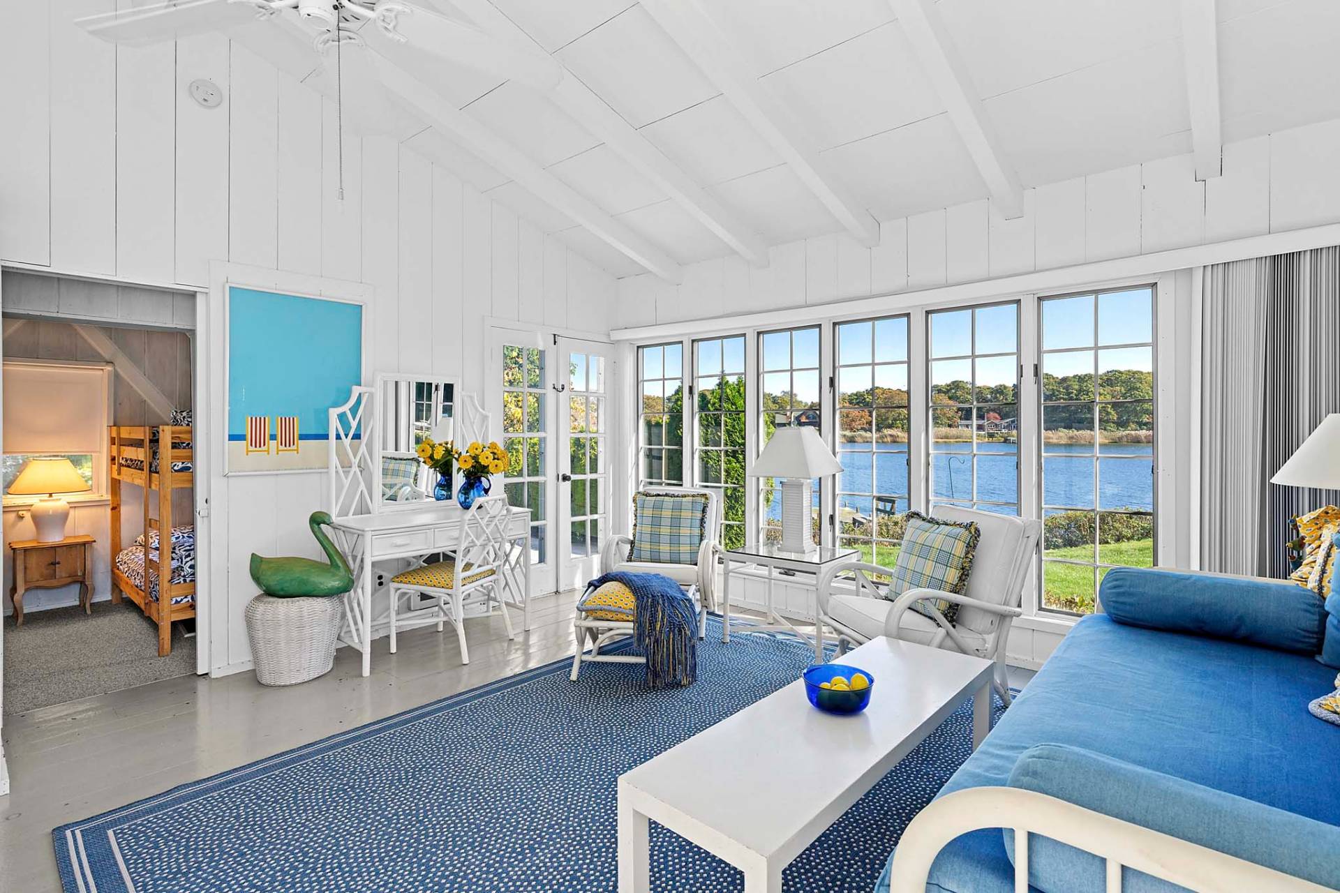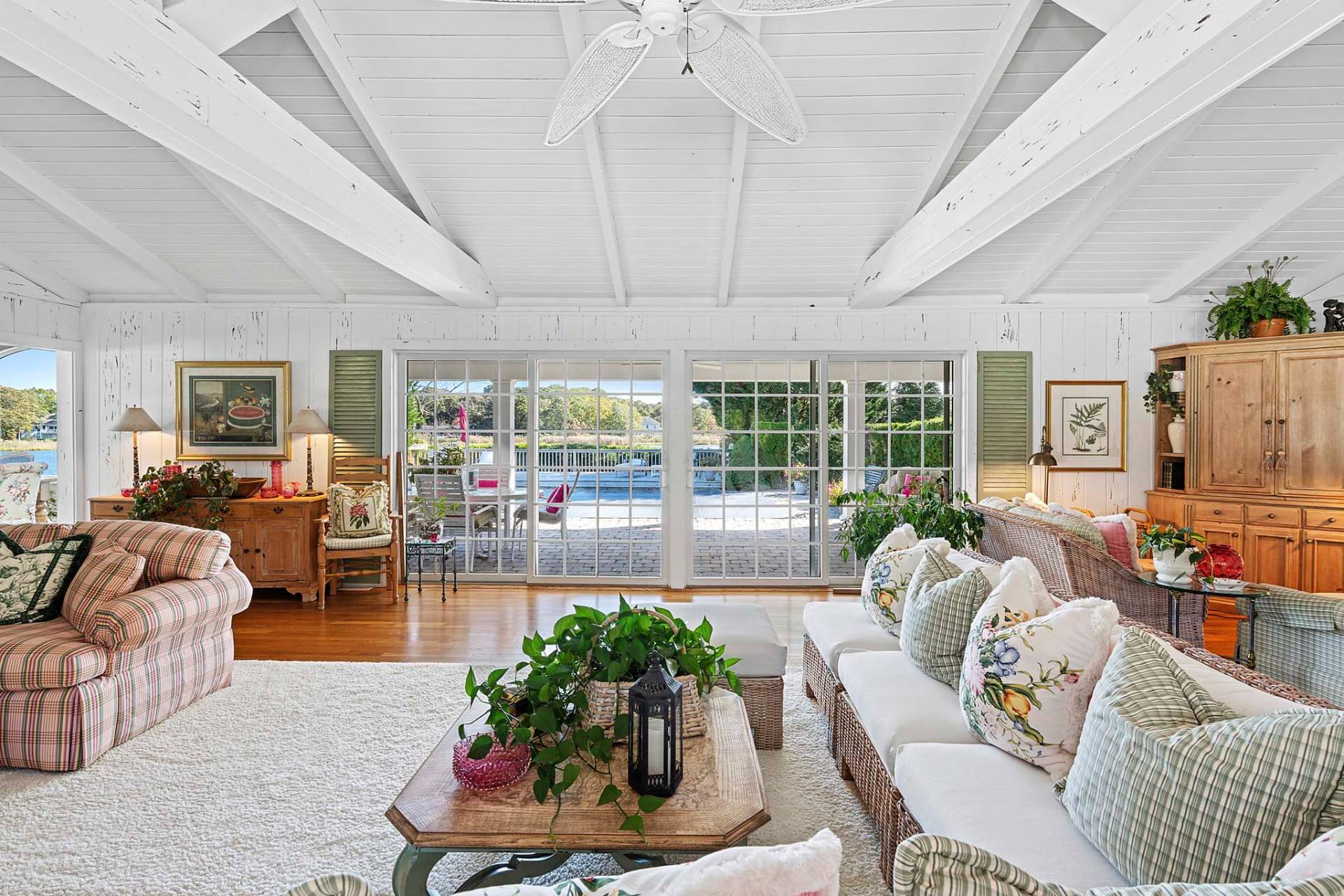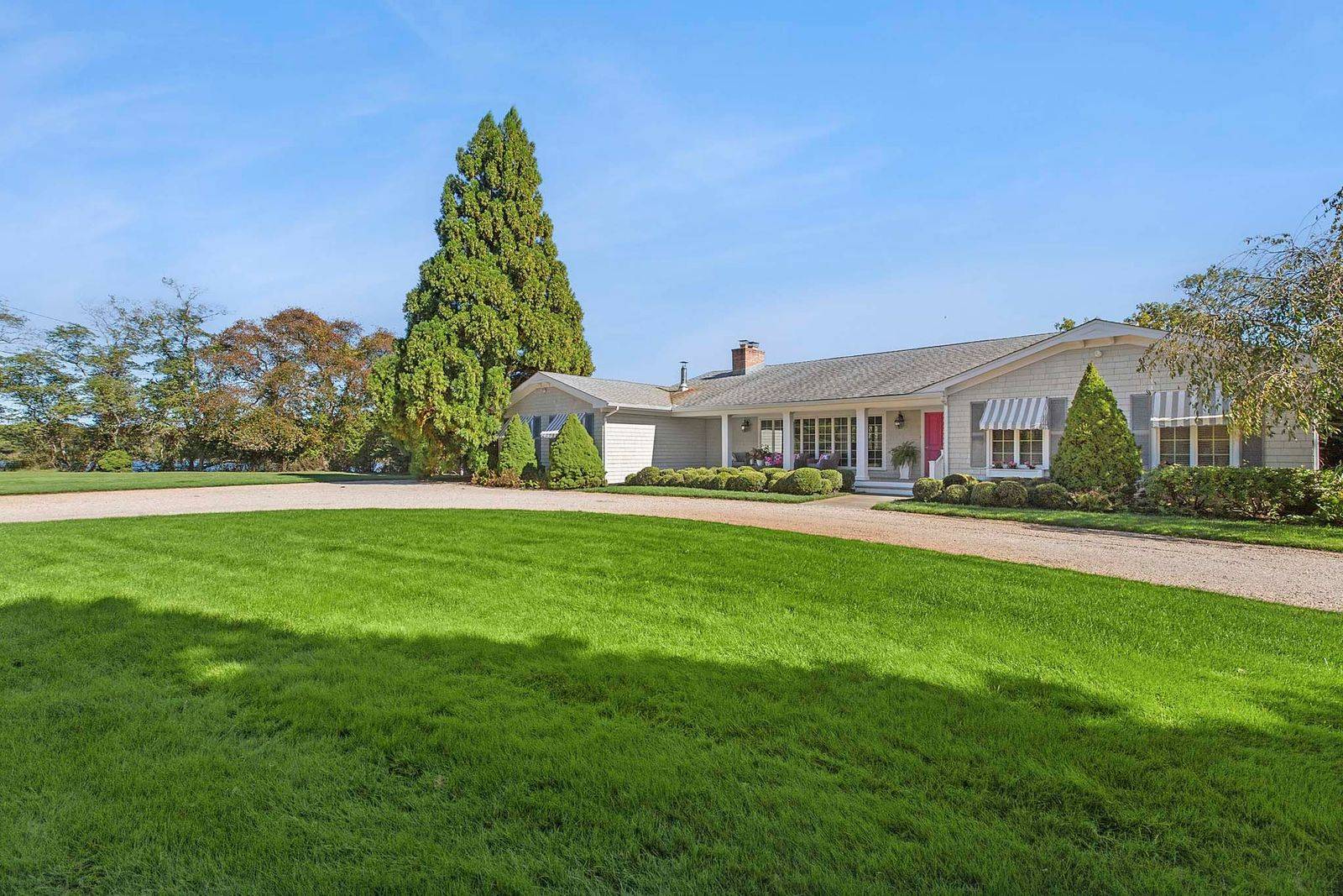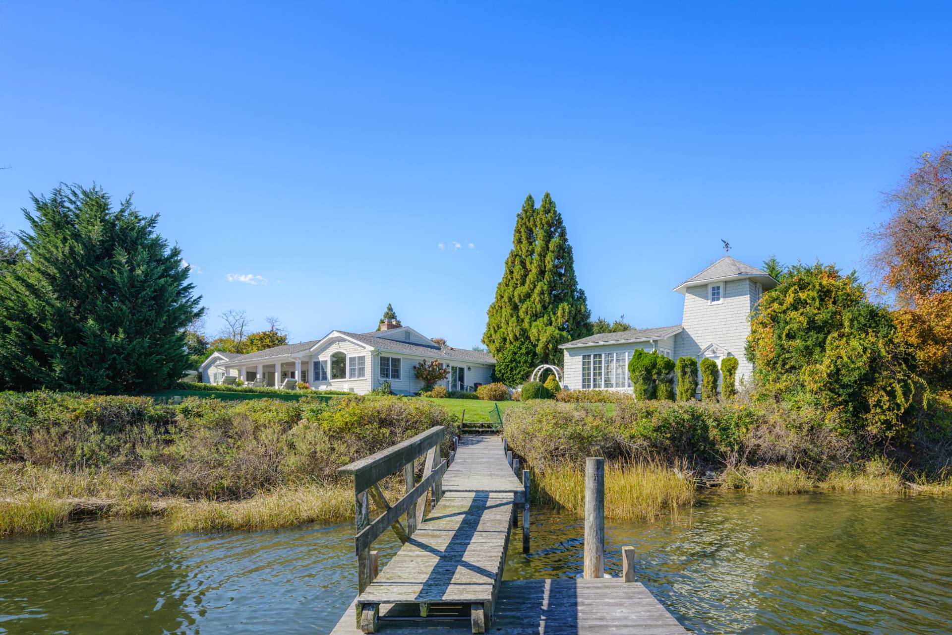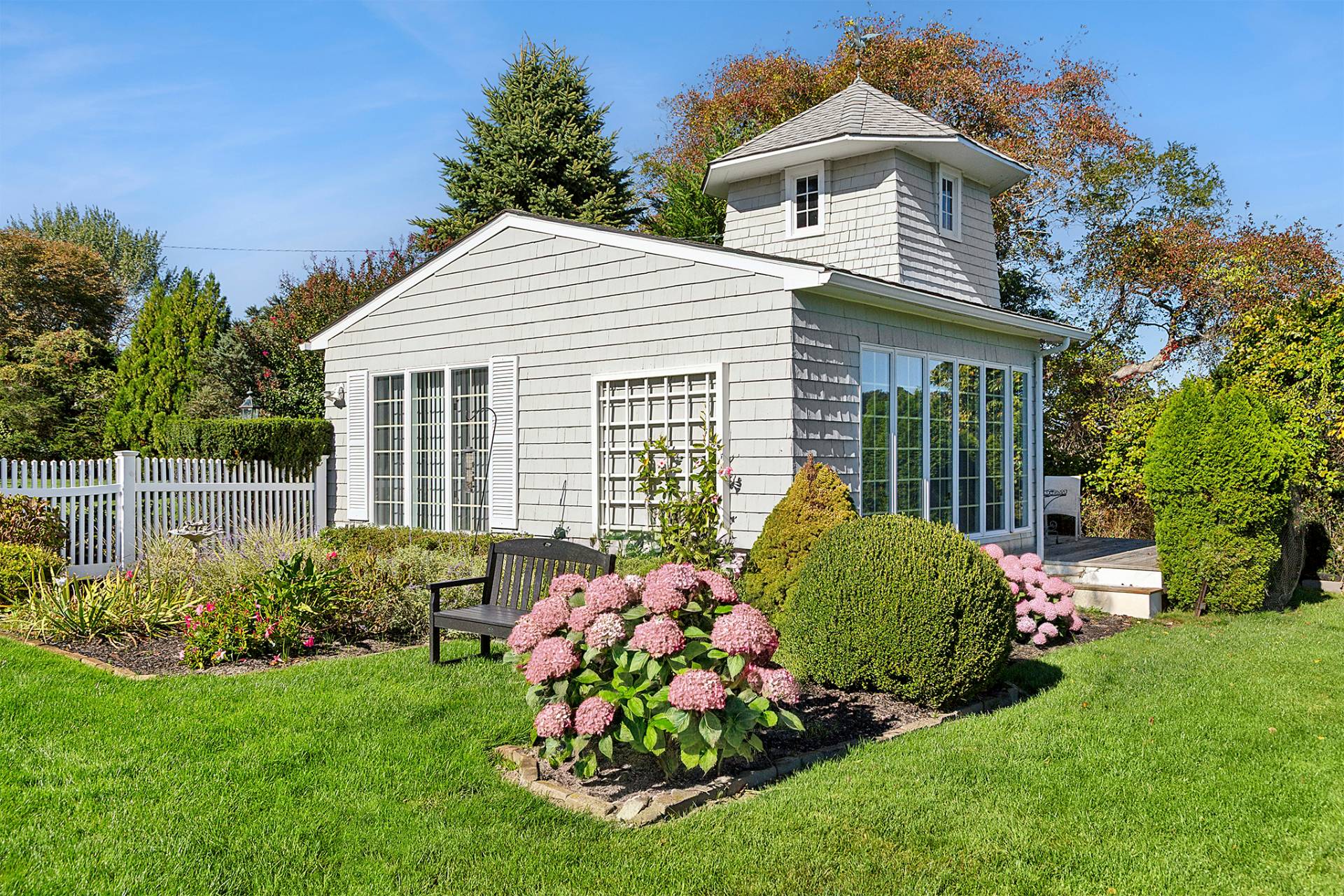 One of the first things you'll notice about this property is just how private and special it is, from the lush landscaping dotted with decades-old specimen trees to the carefully tended English gardens overlooking more than 320' of Quantuck Bay frontage. Located in the historic hamlet of Quiogue (between Quogue and Westhampton Beach), the 1.5-acre property was once part of Quantuck Bay Farms, owned by the Conklin family to service its magnificent Meadowcroft Estate. Remaining evidence of its farming past can be found in the small windmill attached to the property's 479 +/- sq. ft. legal guest cottage. Built in 1958 and lovingly renovated over the years, the single-story main house has 5 bedrooms and 3 baths. The charm of the home begins at its old-fashioned covered porch and fuchsia-colored front door that opens to the expansive 33'x22' great room. The memorable living space features a wood-burning fireplace, shiplap ceiling, wooden cross beams, whitewashed walls, and bank of French doors overlooking the pool and water. From there, head to the beautiful George Vickers-designed chef's kitchen and light-filled dining room offering peaceful water views. The north wing also has a laundry room and two bedrooms. On the south wing, find the primary bedroom suite and two additional bedrooms. The backyard is just as delightful. There you can relax and entertain loved ones and friends under the covered porch and sun and swim by the large deck and heated gunite pool. The outdoor enjoyment continues at the dock, perfect for fishing and launching a kayak or paddleboard. Boating enthusiasts will find it deep enough to keep an outboard boat (approximately 21'). This is a very special property now ready for a new owner to share in its magic and next chapter.