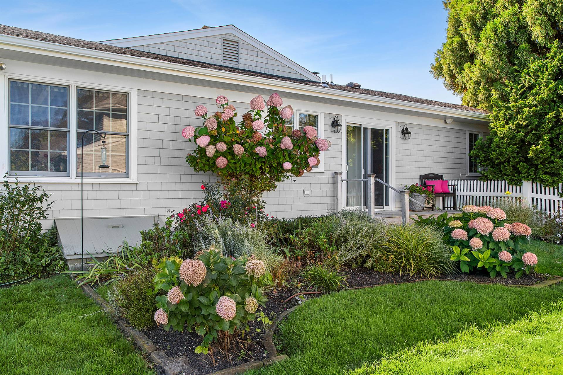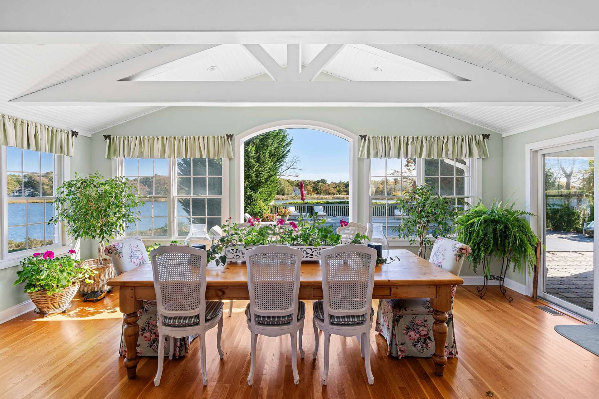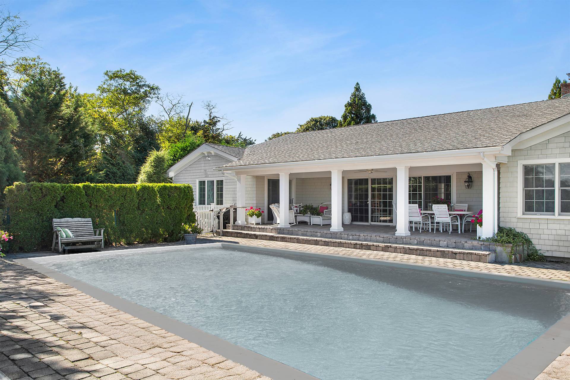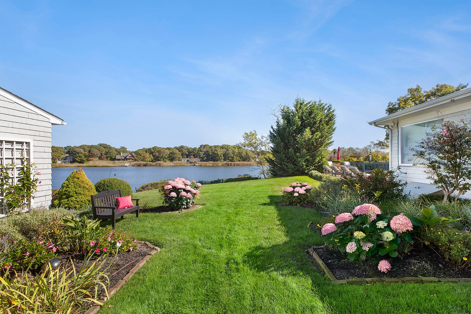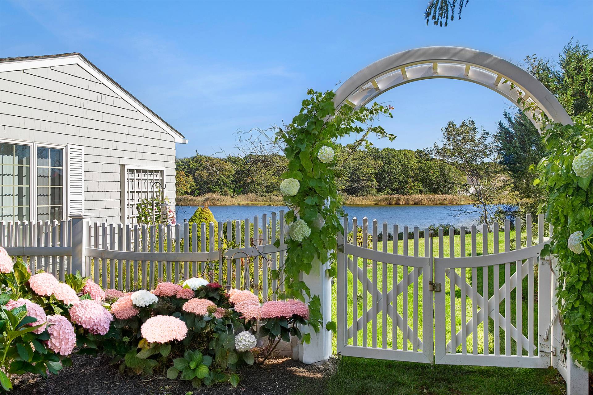 One of the first things you'll notice about this property is just how private and special it is, from the lush landscaping dotted with decades-old specimen trees to the carefully tended English gardens overlooking more than 320' of Quantuck Bay frontage. Located in the historic hamlet of Quiogue (between Quogue and Westhampton Beach), the 1.5-acre property was once part of Quantuck Bay Farms, owned by the Conklin family to service its magnificent Meadowcroft Estate. Remaining evidence of its farming past can be found in the small windmill attached to the property's 479 +/- sq. ft. legal guest cottage. Built in 1958 and lovingly renovated over the years, the single-story main house has 5 bedrooms and 3 baths. The charm of the home begins at its old-fashioned covered porch and fuchsia-colored front door that opens to the expansive 33'x22' great room. The memorable living space features a wood-burning fireplace, shiplap ceiling, wooden cross beams, whitewashed walls, and bank of French doors overlooking the pool and water. From there, head to the beautiful George Vickers-designed chef's kitchen and light-filled dining room offering peaceful water views. The north wing also has a laundry room and two bedrooms. On the south wing, find the primary bedroom suite and two additional bedrooms. The backyard is just as delightful. There you can relax and entertain loved ones and friends under the covered porch and sun and swim by the large deck and heated gunite pool. The outdoor enjoyment continues at the dock, perfect for fishing and launching a kayak or paddleboard. Boating enthusiasts will find it deep enough to keep an outboard boat (approximately 21'). This is a very special property now ready for a new owner to share in its magic and next chapter.