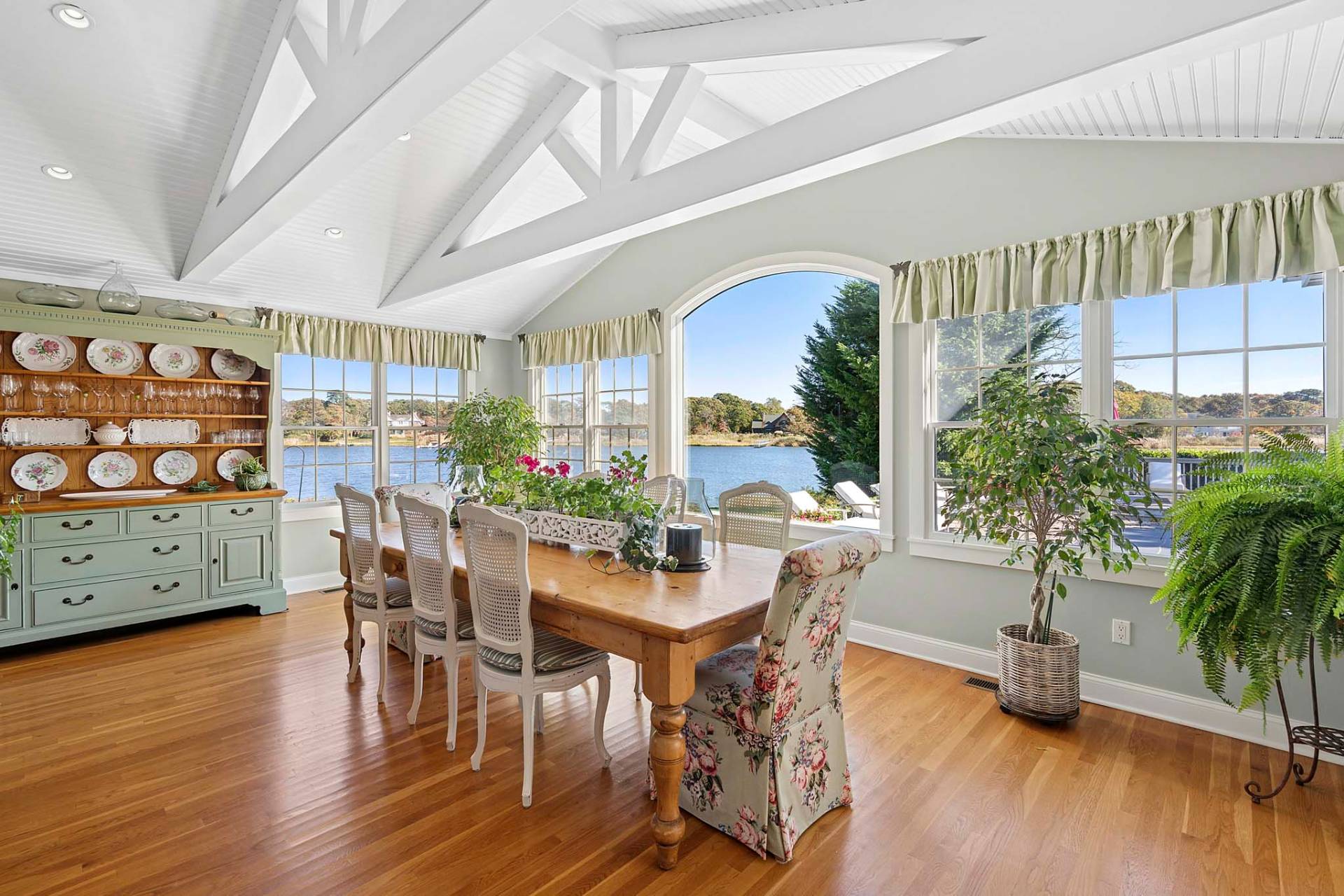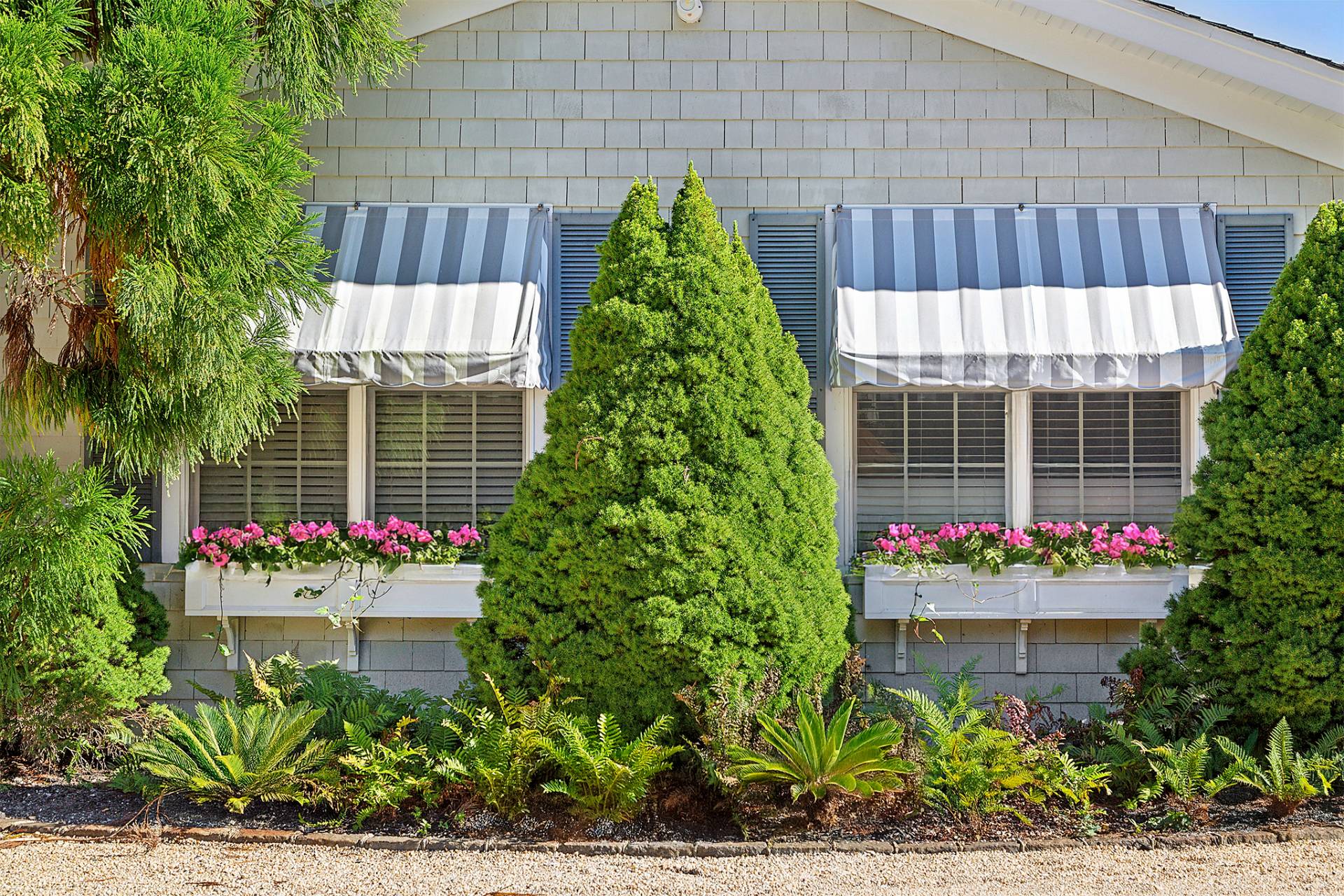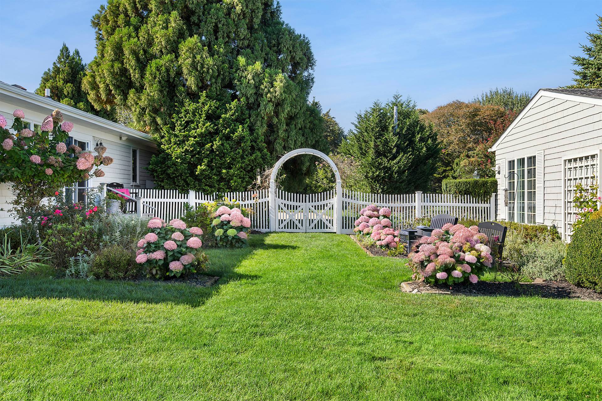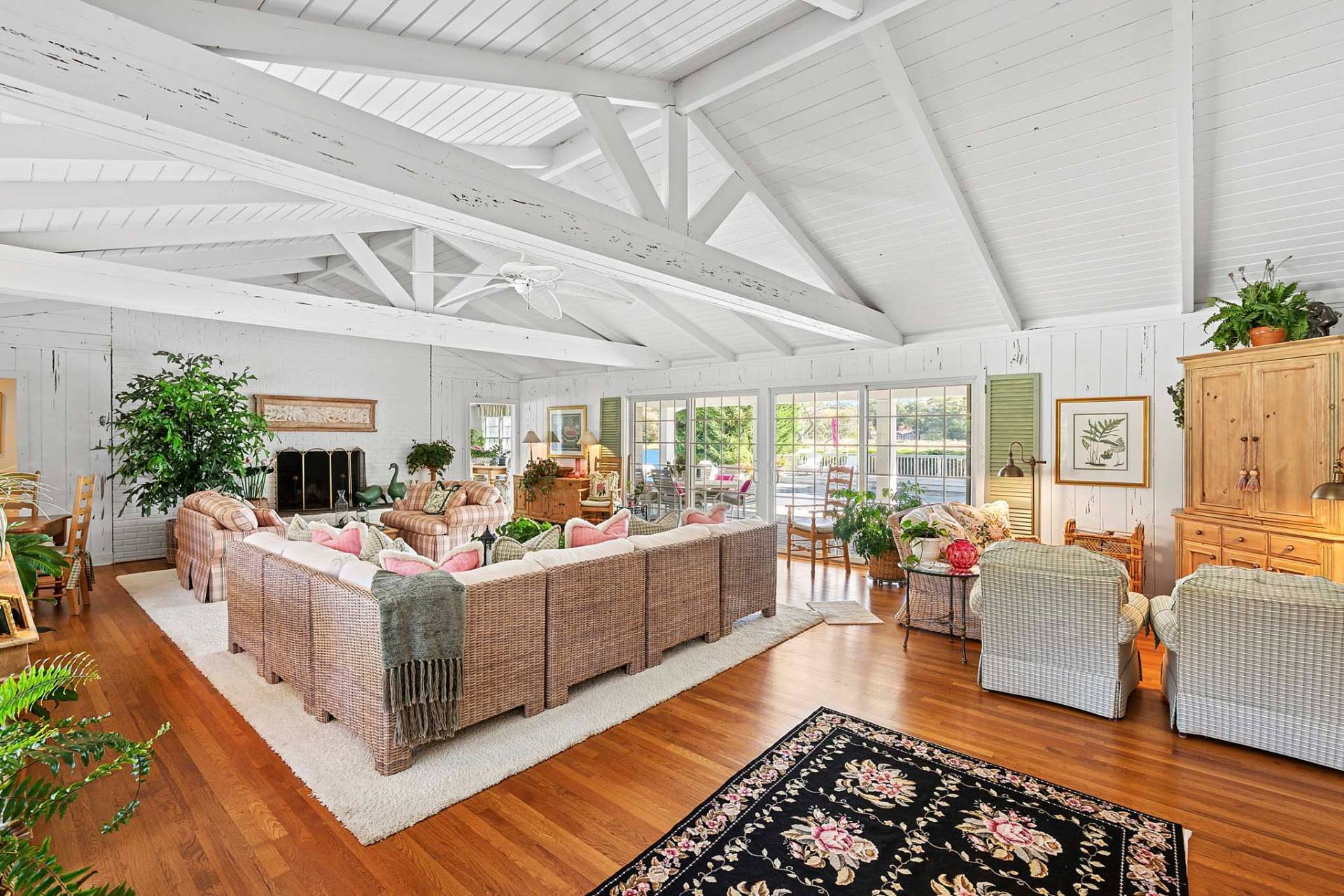 One of the first things you'll notice about this property is just how private and special it is, from the lush landscaping dotted with decades-old specimen trees to the carefully tended English gardens overlooking more than 320' of Quantuck Bay frontage. Located in the historic hamlet of Quiogue (between Quogue and Westhampton Beach), the 1.5-acre property was once part of Quantuck Bay Farms, owned by the Conklin family to service its magnificent Meadowcroft Estate. Remaining evidence of its farming past can be found in the small windmill attached to the property's 479 +/- sq. ft. legal guest cottage. Built in 1958 and lovingly renovated over the years, the single-story main house has 5 bedrooms and 3 baths. The charm of the home begins at its old-fashioned covered porch and fuchsia-colored front door that opens to the expansive 33'x22' great room. The memorable living space features a wood-burning fireplace, shiplap ceiling, wooden cross beams, whitewashed walls, and bank of French doors overlooking the pool and water. From there, head to the beautiful George Vickers-designed chef's kitchen and light-filled dining room offering peaceful water views. The north wing also has a laundry room and two bedrooms. On the south wing, find the primary bedroom suite and two additional bedrooms. The backyard is just as delightful. There you can relax and entertain loved ones and friends under the covered porch and sun and swim by the large deck and heated gunite pool. The outdoor enjoyment continues at the dock, perfect for fishing and launching a kayak or paddleboard. Boating enthusiasts will find it deep enough to keep an outboard boat (approximately 21'). This is a very special property now ready for a new owner to share in its magic and next chapter.