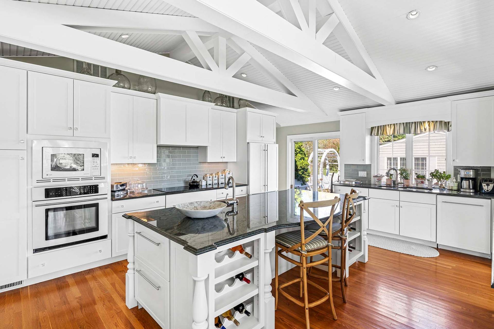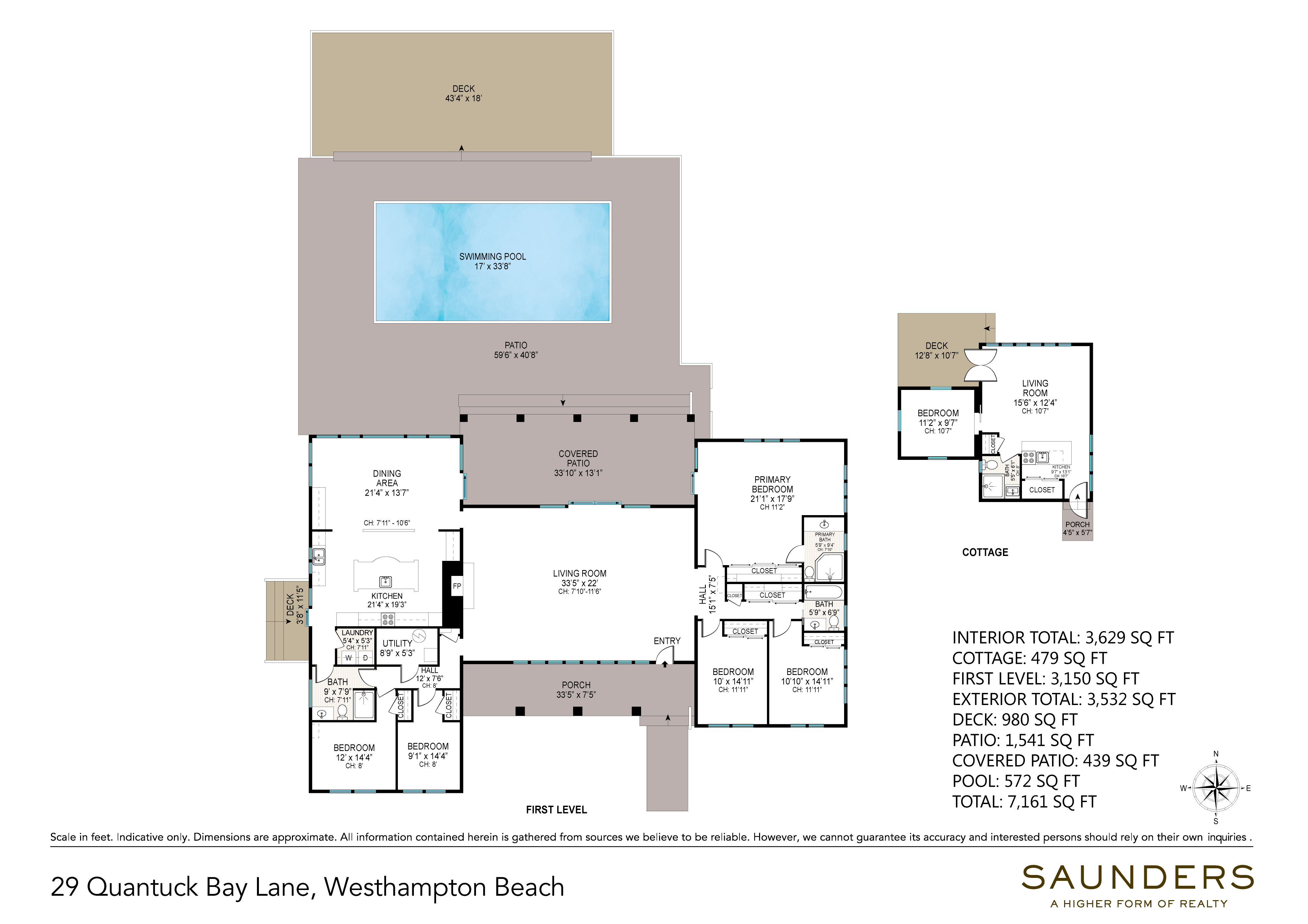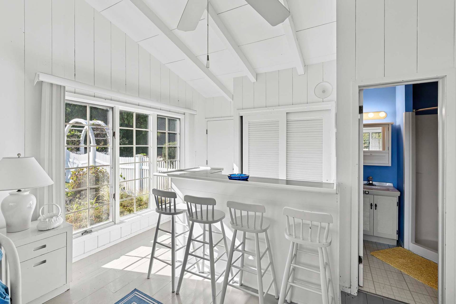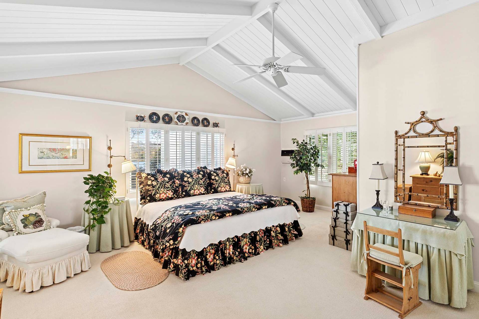 One of the first things you'll notice about this property is just how private and special it is, from the lush landscaping dotted with decades-old specimen trees to the carefully tended English gardens overlooking more than 320' of Quantuck Bay frontage. Located in the historic hamlet of Quiogue (between Quogue and Westhampton Beach), the 1.5-acre property was once part of Quantuck Bay Farms, owned by the Conklin family to service its magnificent Meadowcroft Estate. Remaining evidence of its farming past can be found in the small windmill attached to the property's 479 +/- sq. ft. legal guest cottage. Built in 1958 and lovingly renovated over the years, the single-story main house has 5 bedrooms and 3 baths. The charm of the home begins at its old-fashioned covered porch and fuchsia-colored front door that opens to the expansive 33'x22' great room. The memorable living space features a wood-burning fireplace, shiplap ceiling, wooden cross beams, whitewashed walls, and bank of French doors overlooking the pool and water. From there, head to the beautiful George Vickers-designed chef's kitchen and light-filled dining room offering peaceful water views. The north wing also has a laundry room and two bedrooms. On the south wing, find the primary bedroom suite and two additional bedrooms. The backyard is just as delightful. There you can relax and entertain loved ones and friends under the covered porch and sun and swim by the large deck and heated gunite pool. The outdoor enjoyment continues at the dock, perfect for fishing and launching a kayak or paddleboard. Boating enthusiasts will find it deep enough to keep an outboard boat (approximately 21'). This is a very special property now ready for a new owner to share in its magic and next chapter.