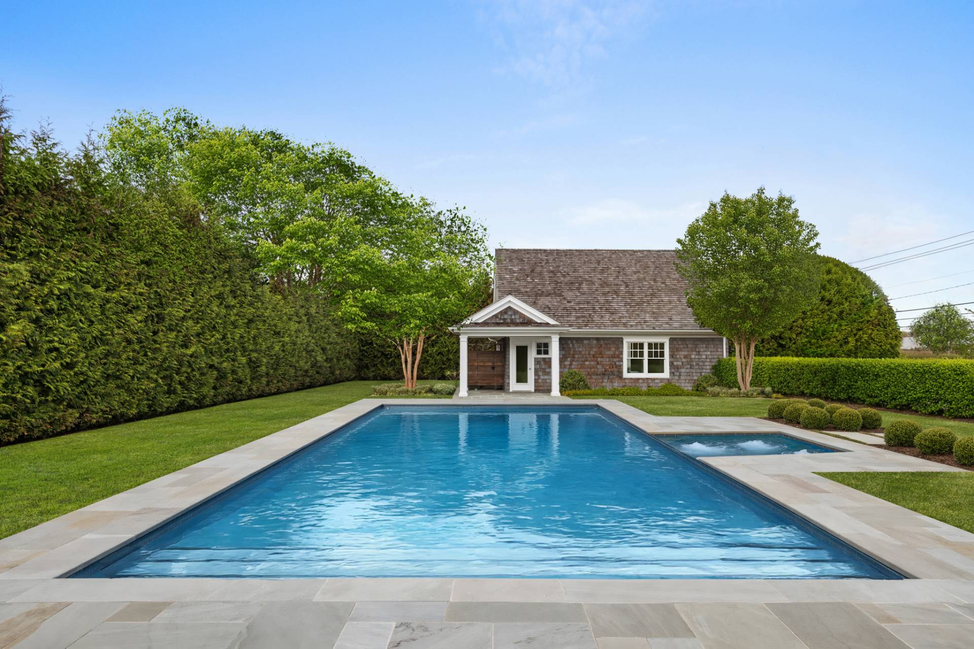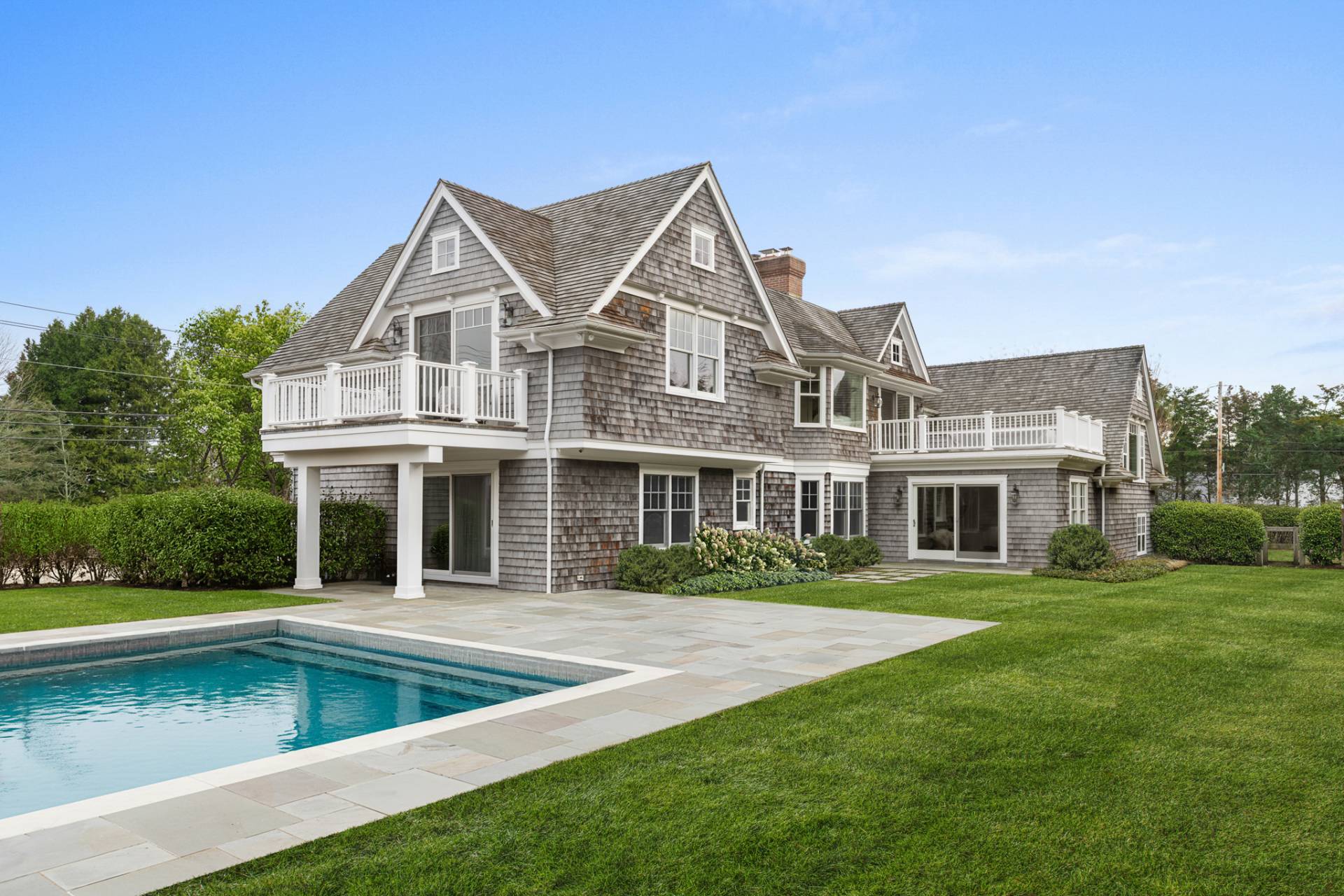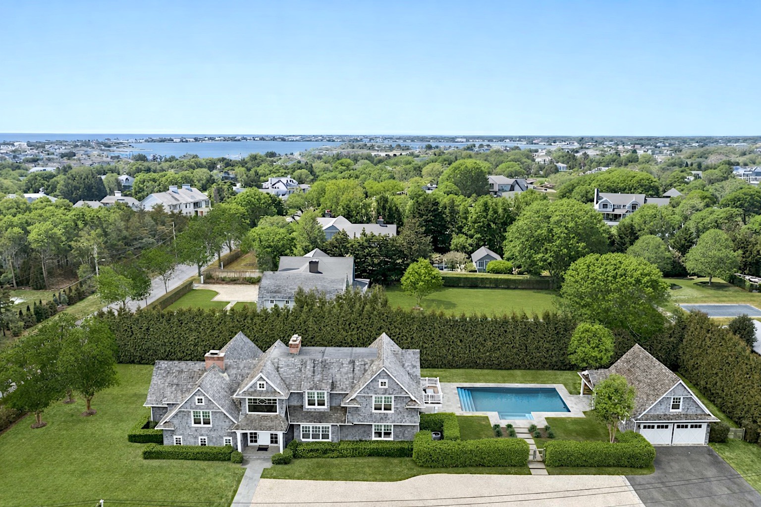 Located south of Quogue Street in the heart of coveted Quogue Village, this extraordinary custom-built estate presents a rare opportunity to own a truly chic and quite distinctive Hamptons retreat. Privately set behind tall hedgerows and gated entry on nearly one acre at a prestigious corner, this sun-filled cedar-shingled residence blends Scandinavian-inspired architectural design with refined Hamptons elegance, offering unparalleled luxury for both seasonal and year-round living. Spanning 5,792 +/- SF across 4 beautifully designed levels, the recently updated home features 6 generously sized bedrooms and 5.5 bathrooms, including multiple en-suite guest accommodations. Interiors are defined by soaring ceilings, dramatic architectural lines, exposed beams, and abundant natural light from multiple orientations throughout the day and evening. A striking double-sided fireplace anchors the open living spaces, seamlessly connecting the great room, living room, and a designer chef's kitchen equipped with state-of-the-art appliances and custom finishes. A gracious dining area completes this exceptional entertaining space. The primary suite is a private sanctuary exceeding 1,000 SF, featuring a sitting room/ den with fireplace, office, expansive dressing room, and a luxurious spa-inspired bath. Additional guest suites include five beautifully appointed bedrooms, several en-suite, including two first-floor suites one with direct access to the pool and patio, ideal for easy indoor-outdoor living. Outdoors, resort-style amenities include a custom 20'x40' heated saltwater Gunite pool and 8'x10' spa, pool bath, outdoor shower and changing room, expansive patios, and manicured grounds, creating a serene and private setting for entertaining and relaxation. A separate space above the two-car garage with an EV charging station adds exceptional flexibility and can easily be transformed into a home office, wellness studio, or creative retreat. With impeccable designer furnishings, smart home technology, and sophisticated, turnkey interiors, this remarkable estate provides immediate enjoyment. Moments from Jitney, pristine ocean beaches, village shops, dining, and transportation, this is a rare legacy offering in one of the Hamptons' most desirable enclaves.