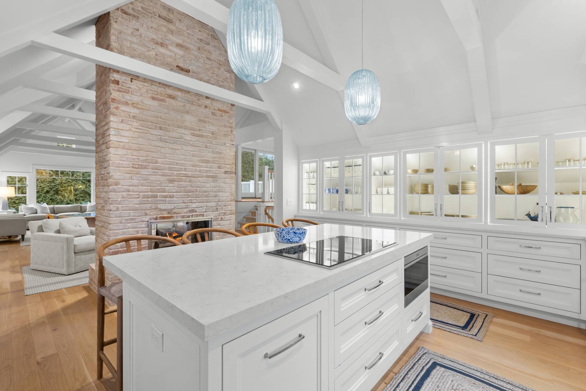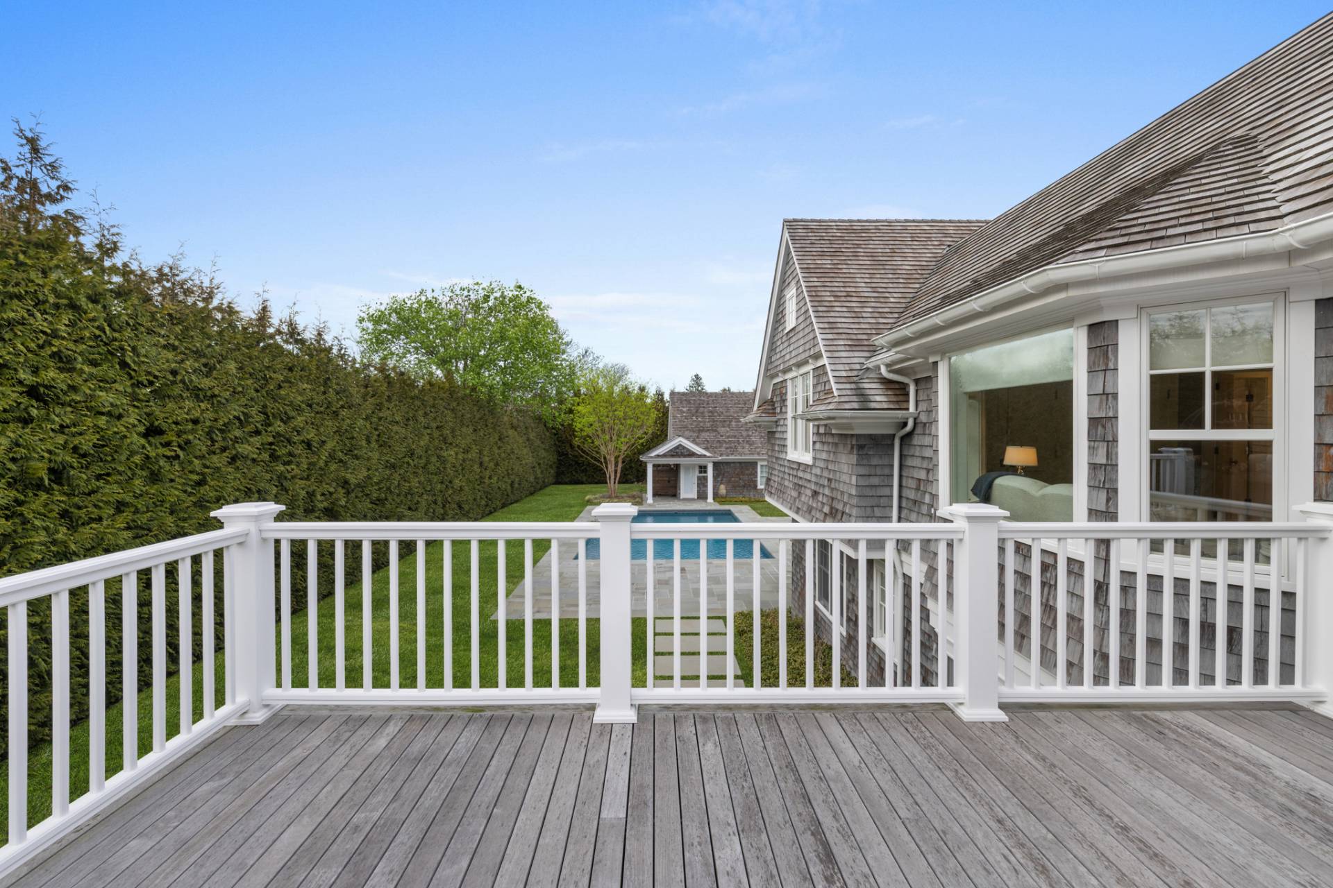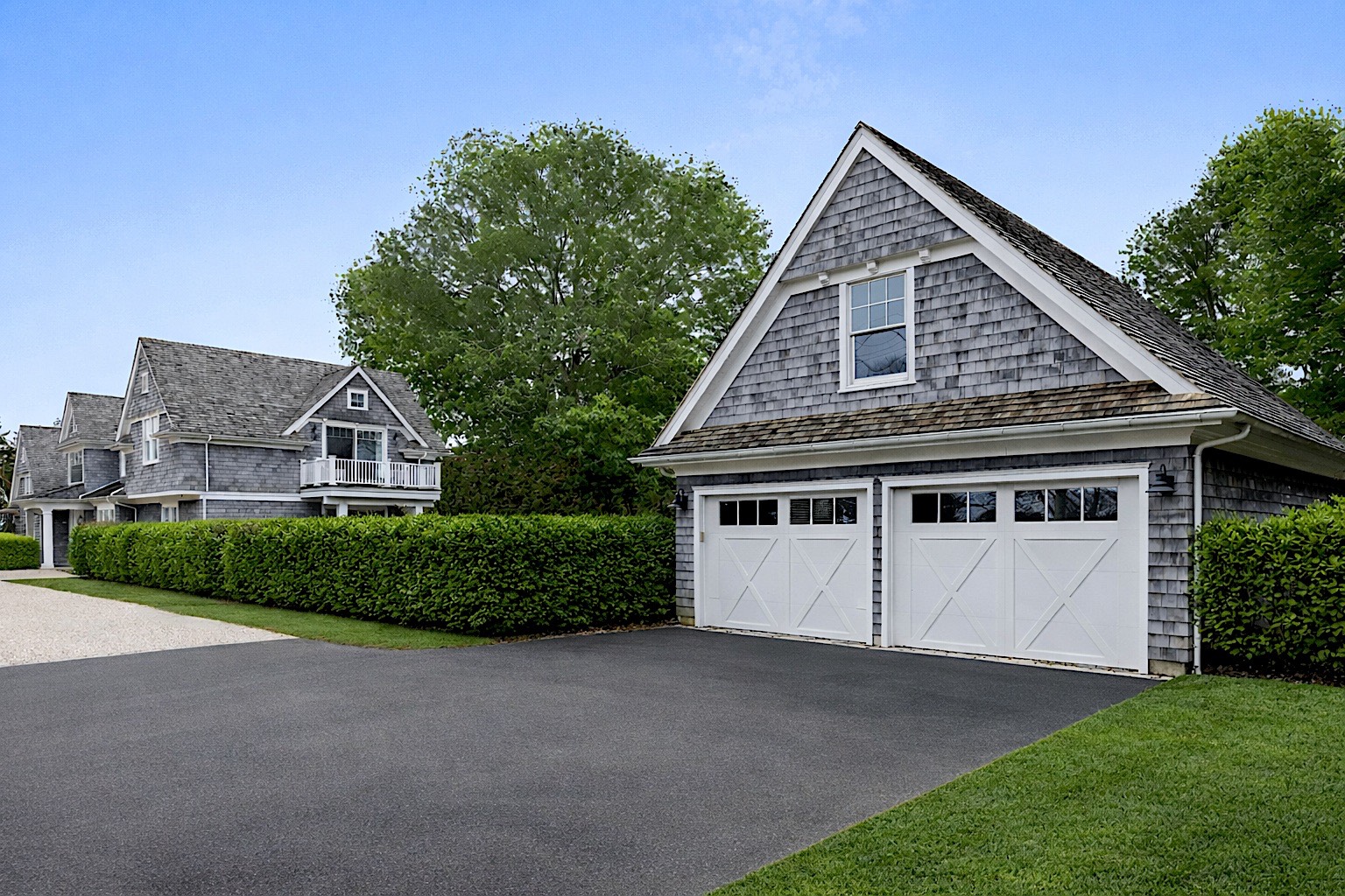 Located south of Quogue Street in the heart of coveted Quogue Village, this extraordinary custom-built estate presents a rare opportunity to own a truly chic and quite distinctive Hamptons retreat. Privately set behind tall hedgerows and gated entry on nearly one acre at a prestigious corner, this sun-filled cedar-shingled residence blends Scandinavian-inspired architectural design with refined Hamptons elegance, offering unparalleled luxury for both seasonal and year-round living. Spanning 5,792 +/- SF across 4 beautifully designed levels, the recently updated home features 6 generously sized bedrooms and 5.5 bathrooms, including multiple en-suite guest accommodations. Interiors are defined by soaring ceilings, dramatic architectural lines, exposed beams, and abundant natural light from multiple orientations throughout the day and evening. A striking double-sided fireplace anchors the open living spaces, seamlessly connecting the great room, living room, and a designer chef's kitchen equipped with state-of-the-art appliances and custom finishes. A gracious dining area completes this exceptional entertaining space. The primary suite is a private sanctuary exceeding 1,000 SF, featuring a sitting room/ den with fireplace, office, expansive dressing room, and a luxurious spa-inspired bath. Additional guest suites include five beautifully appointed bedrooms, several en-suite, including two first-floor suites one with direct access to the pool and patio, ideal for easy indoor-outdoor living. Outdoors, resort-style amenities include a custom 20'x40' heated saltwater Gunite pool and 8'x10' spa, pool bath, outdoor shower and changing room, expansive patios, and manicured grounds, creating a serene and private setting for entertaining and relaxation. A separate space above the two-car garage with an EV charging station adds exceptional flexibility and can easily be transformed into a home office, wellness studio, or creative retreat. With impeccable designer furnishings, smart home technology, and sophisticated, turnkey interiors, this remarkable estate provides immediate enjoyment. Moments from Jitney, pristine ocean beaches, village shops, dining, and transportation, this is a rare legacy offering in one of the Hamptons' most desirable enclaves.