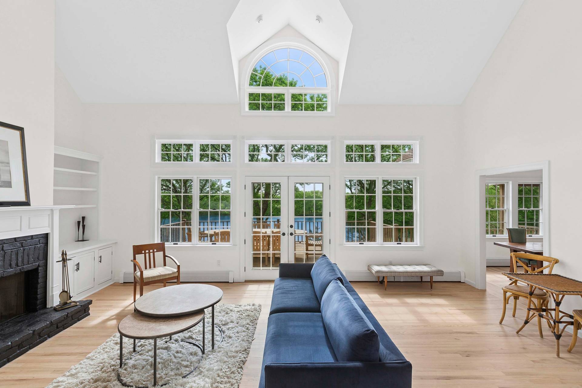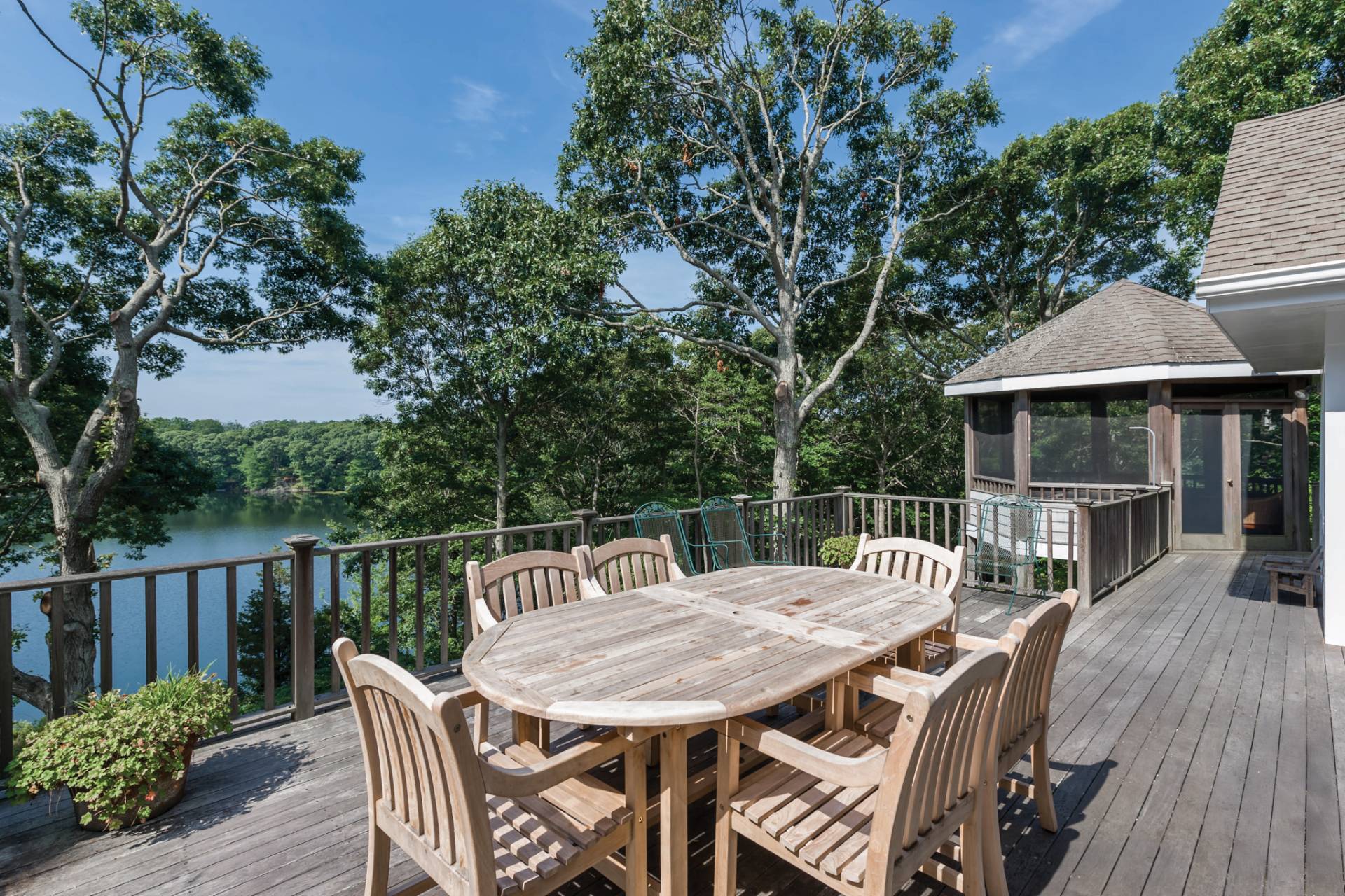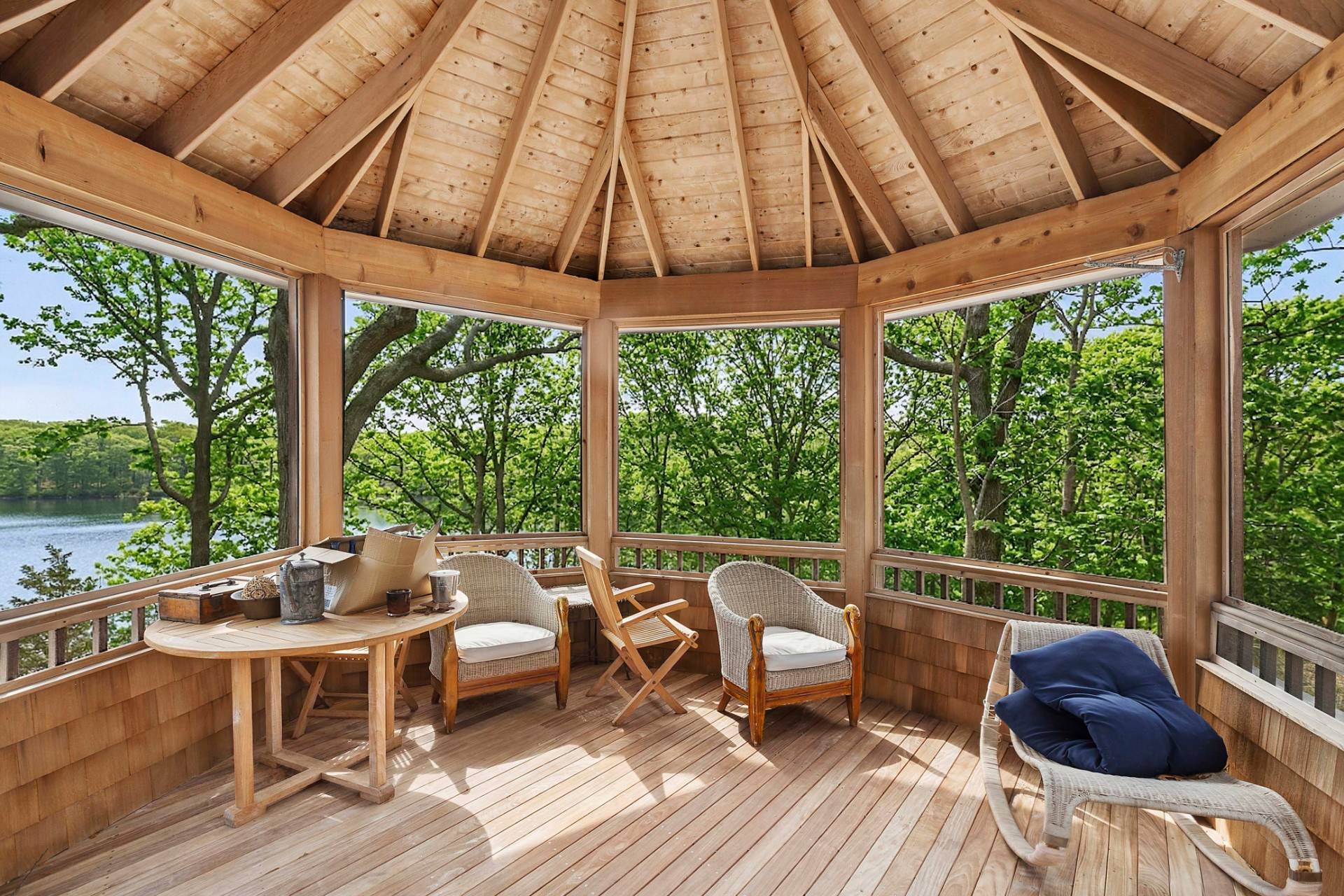 Set on 1.19± acres overlooking Fresh Pond, this traditional offers privacy, an elevated position overlooking the water, and southwest-facing light with sunset views. Largely hidden from the road, the property enjoys a quiet setting above one of Shelter Island's treasured glacial freshwater ponds. A gravel circular drive approaches the cedar-shingled façade, framed by established landscaping and gabled rooflines. The interior has been updated in 2026, including refinished floors, renovated bathrooms, refreshed exteriors and freshly painted interiors. A gracious entry is framed by a covered porch and a central Palladian-style window above the front door, bringing natural light into the foyer and halls. The double-height living room is imbued with natural light from a wall of windows and glass doors, creating an open yet grounded gathering space centered on a fireplace with custom built-ins. Above, a connecting balcony spans the room, linking the upper level while maintaining a sense of separation between the bedroom wings. The kitchen includes a center prep island and a breakfast bar, with an adjacent dining area facing the pond. A laundry room and powder room are set just off the kitchen, with convenient access to the attached two-car garage. The first-floor primary bedroom includes a renovated bath and walk-in closet. Upstairs, two additional bedrooms reflect the home's architecture, with varied ceiling lines that add dimension. The lower level has a finished office with separate entrance and an unfinished area with waterside windows that are ready for finishing. Outdoor amenities include a hot tub overlooking the water and a screened gazebo positioned for relaxed afternoons or casual gatherings. A path leads down to the pond and dock, offering access to the shoreline and the surrounding landscape.