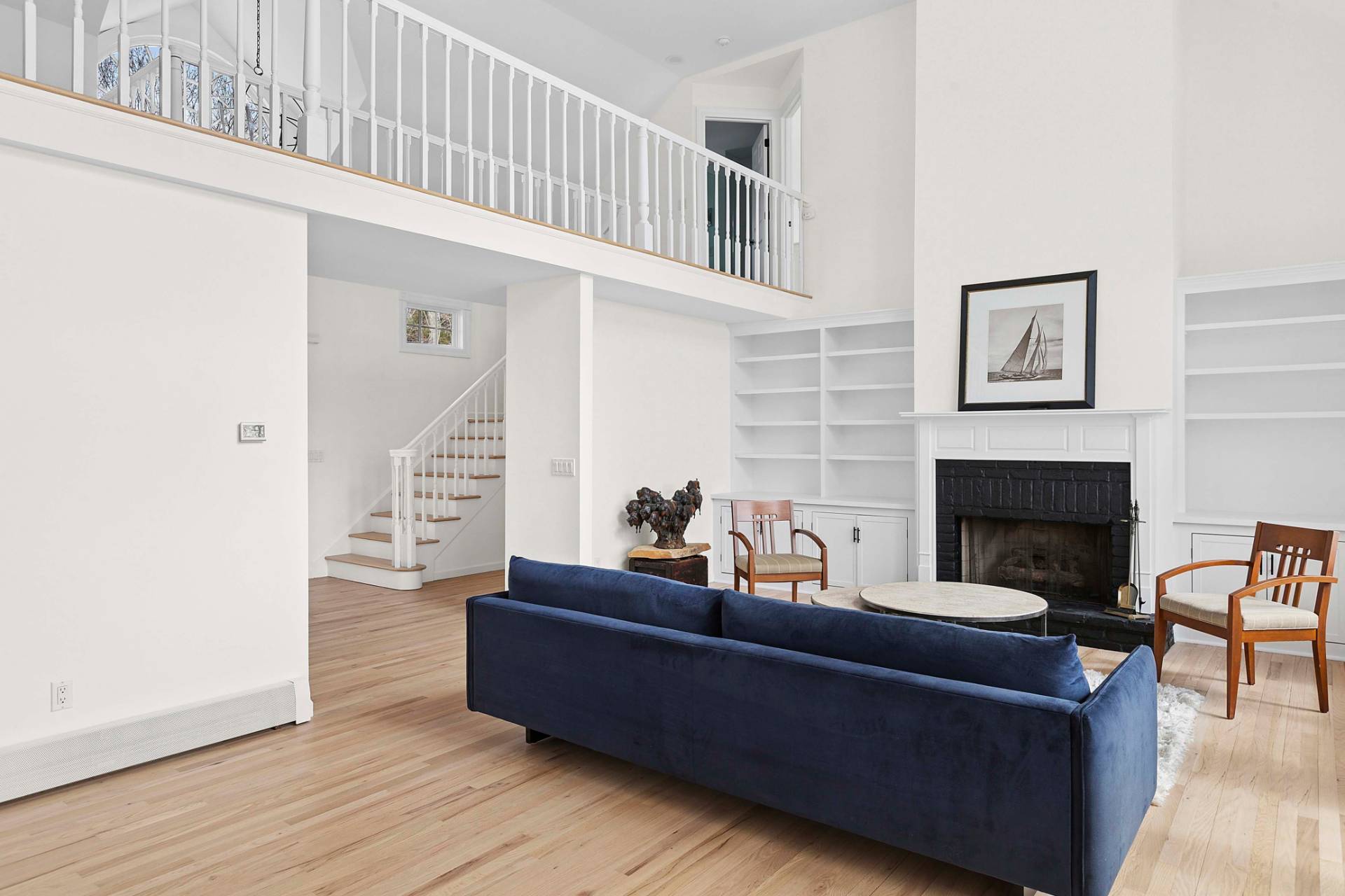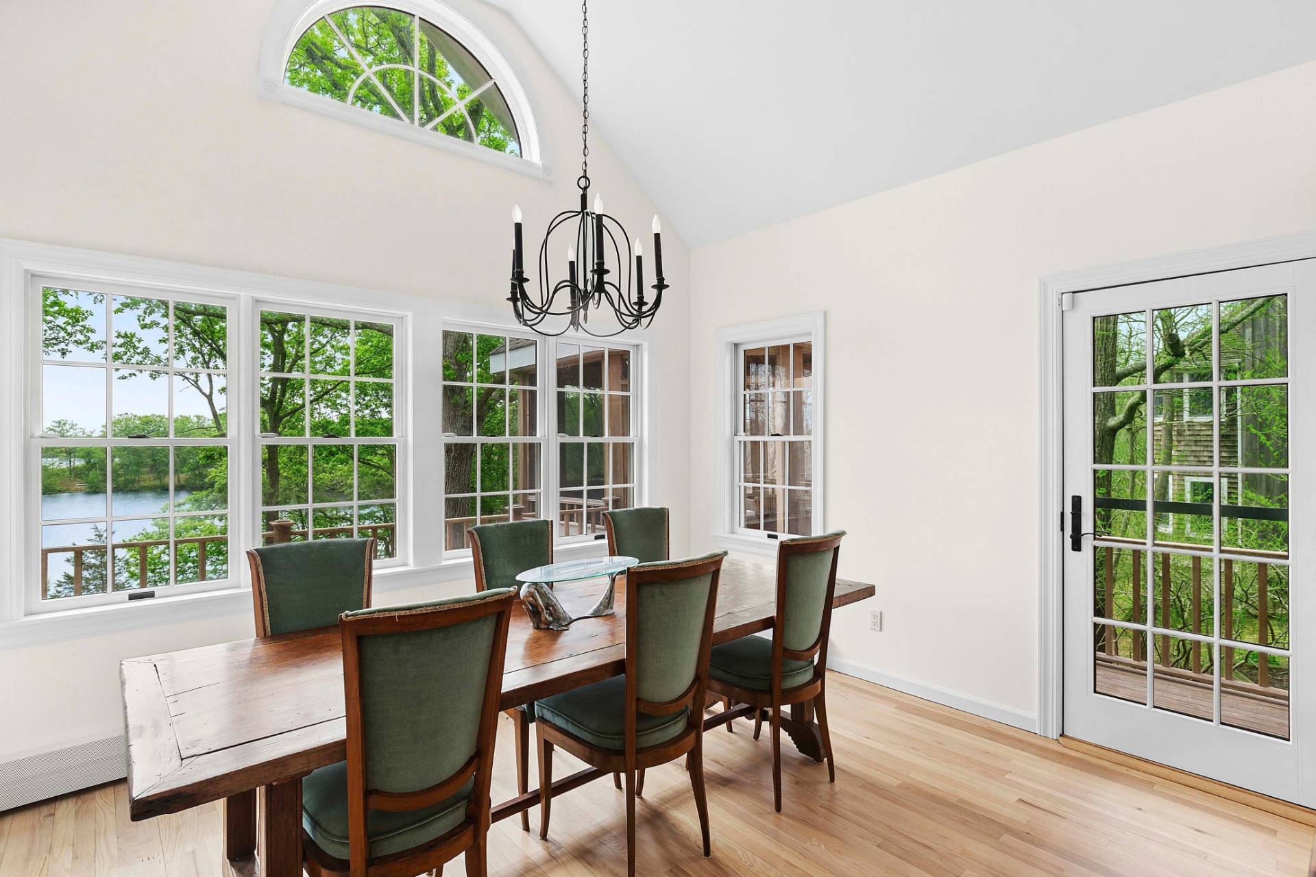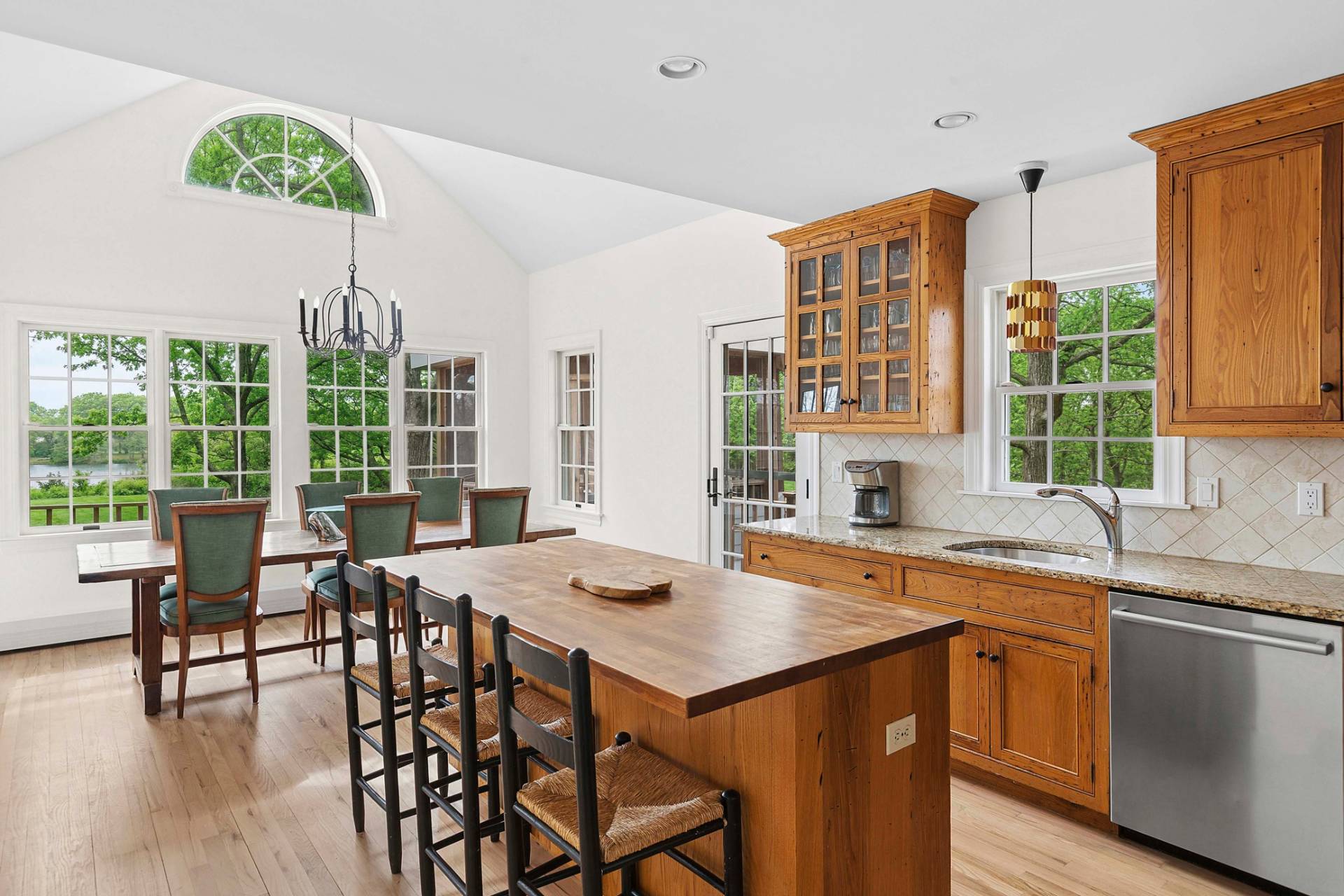 Set on 1.19± acres overlooking Fresh Pond, this traditional offers privacy, an elevated position overlooking the water, and southwest-facing light with sunset views. Largely hidden from the road, the property enjoys a quiet setting above one of Shelter Island's treasured glacial freshwater ponds. A gravel circular drive approaches the cedar-shingled façade, framed by established landscaping and gabled rooflines. The interior has been updated in 2026, including refinished floors, renovated bathrooms, refreshed exteriors and freshly painted interiors. A gracious entry is framed by a covered porch and a central Palladian-style window above the front door, bringing natural light into the foyer and halls. The double-height living room is imbued with natural light from a wall of windows and glass doors, creating an open yet grounded gathering space centered on a fireplace with custom built-ins. Above, a connecting balcony spans the room, linking the upper level while maintaining a sense of separation between the bedroom wings. The kitchen includes a center prep island and a breakfast bar, with an adjacent dining area facing the pond. A laundry room and powder room are set just off the kitchen, with convenient access to the attached two-car garage. The first-floor primary bedroom includes a renovated bath and walk-in closet. Upstairs, two additional bedrooms reflect the home's architecture, with varied ceiling lines that add dimension. The lower level has a finished office with separate entrance and an unfinished area with waterside windows that are ready for finishing. Outdoor amenities include a hot tub overlooking the water and a screened gazebo positioned for relaxed afternoons or casual gatherings. A path leads down to the pond and dock, offering access to the shoreline and the surrounding landscape.
